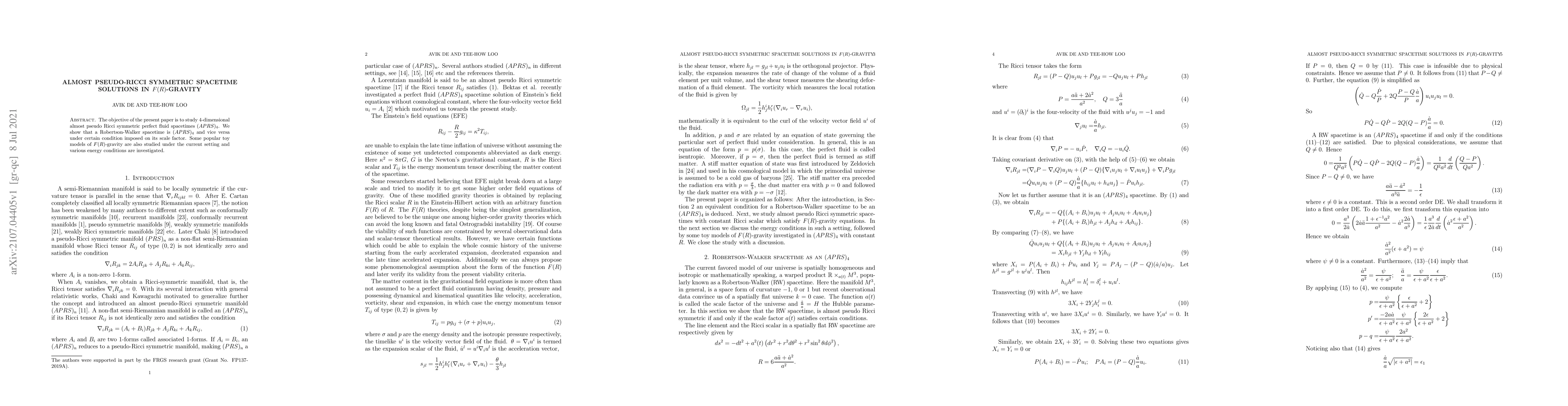 The objective of the present paper is to study 4-dimensional almost pseudo Ricci symmetric perfect fluid spacetimes $(APRS)_4$. We show that a Robertson-Walker spacetime is $(APRS)_4$ and vice versa under certain condition imposed on its scale factor. Some popular toy models of $F(R)$-gravity are also studied under the current setting and various energy conditions are investigated.
