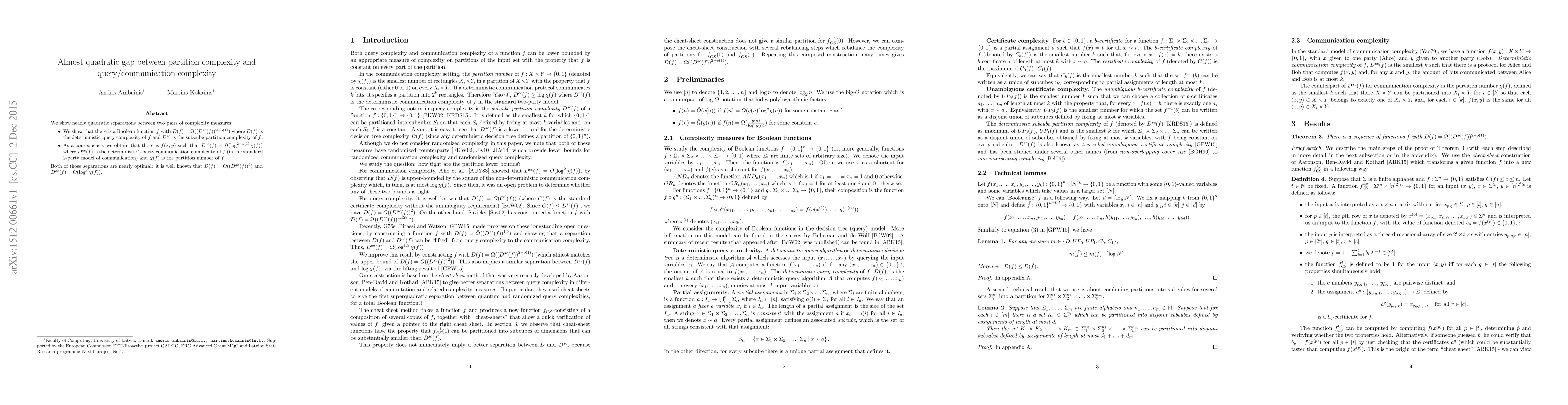 This paper demonstrates nearly quadratic separations between partition complexity and query/communication complexity for Boolean functions. It shows that for certain functions, the deterministic query complexity is significantly larger than the square of the subcube partition complexity, and similarly for communication tasks, the deterministic communication complexity is larger than the logarithm squared of the partition number.