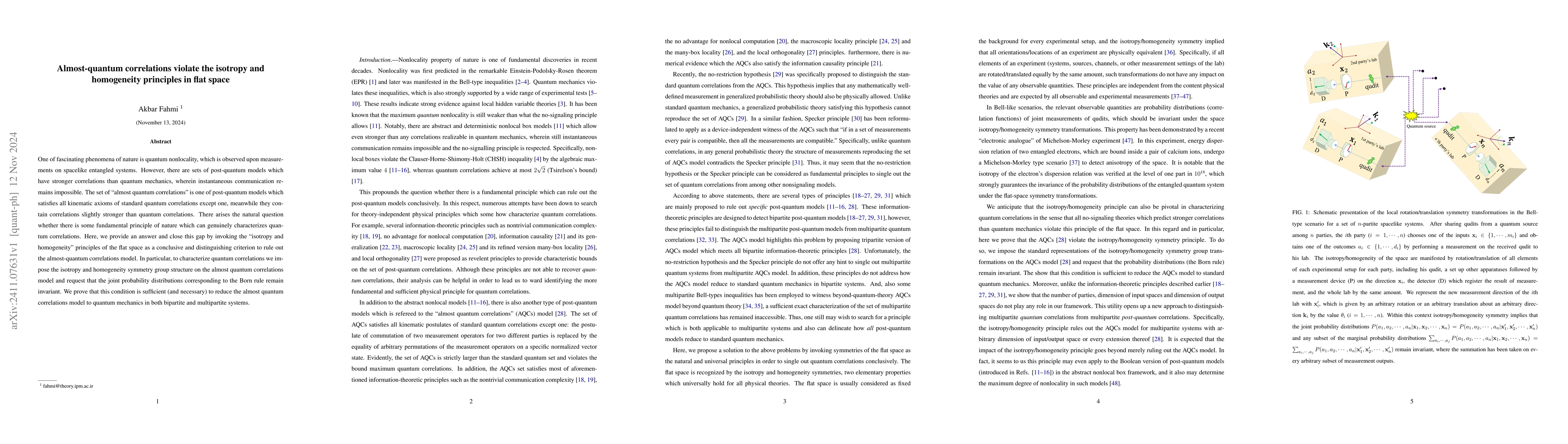 This paper demonstrates that almost-quantum correlations, which possess stronger correlations than quantum mechanics, violate the isotropy and homogeneity principles in flat space. By imposing these principles, the authors show that these correlations can be reduced to quantum mechanics.