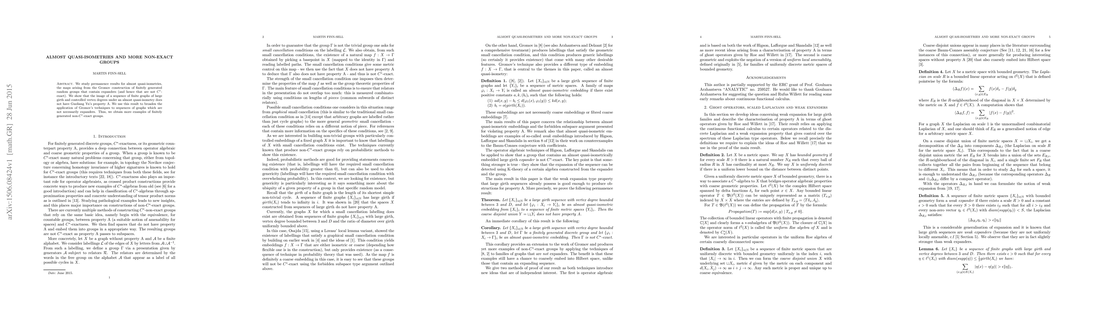 We study permanence results for almost quasi-isometries, the maps arising from the Gromov construction of finitely generated random groups that contain expanders (and hence that are not C*-exact). We show that the image of a sequence of finite graphs of large girth and controlled vertex degrees under an almost quasi-isometry does not have Guoliang Yu's property A. We use this result to broaden the application of Gromov's techniques to sequences of graphs which are not necessarily expanders. Thus, we obtain more examples of finitely generated non-C*-exact groups.