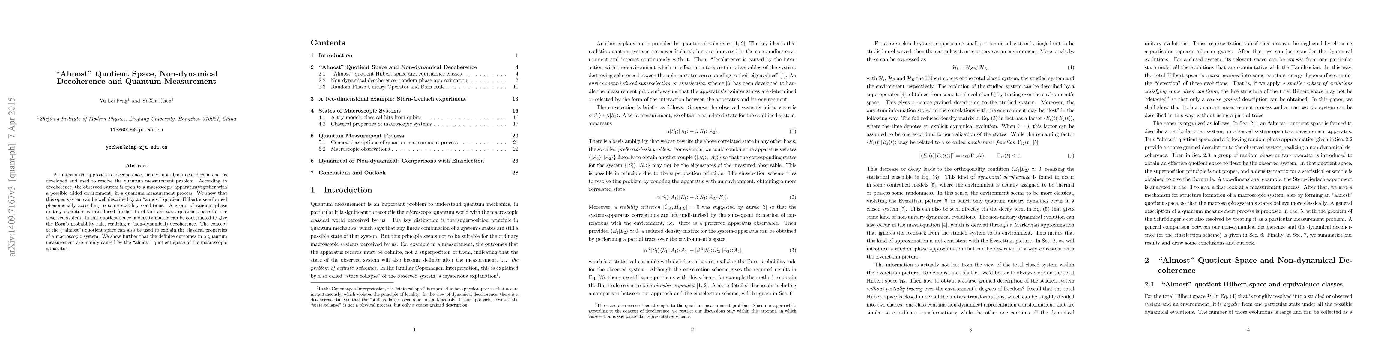 An alternative approach to decoherence, named non-dynamical decoherence is developed and used to resolve the quantum measurement problem. According to decoherence, the observed system is open to a macroscopic apparatus(together with a possible added environment) in a quantum measurement process. We show that this open system can be well described by an "almost" quotient Hilbert space formed phenomenally according to some stability conditions. A group of random phase unitary operators is introduced further to obtain an exact quotient space for the observed system. In this quotient space, a density matrix can be constructed to give the Born's probability rule, realizing a (non-dynamical) decoherence. The concept of the ("almost") quotient space can also be used to explain the classical properties of a macroscopic system. We show further that the definite outcomes in a quantum measurement are mainly caused by the "almost" quotient space of the macroscopic apparatus.