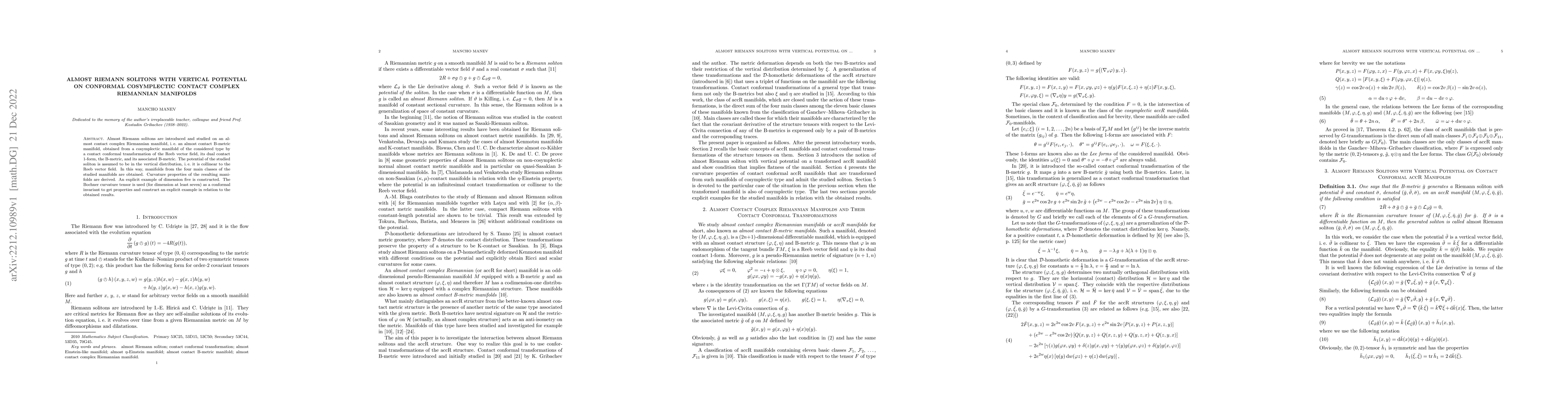 Almost Riemann solitons are introduced and studied on an almost contact complex Riemannian manifold, i.e. an almost contact B-metric manifold, obtained from a cosymplectic manifold of the considered type by a contact conformal transformation of the Reeb vector field, its dual contact 1-form, the B-metric, and its associated B-metric. The potential of the studied soliton is assumed to be in the vertical distribution, i.e. it is collinear to the Reeb vector field. In this way, manifolds from the four main classes of the studied manifolds are obtained. Curvature properties of the resulting manifolds are derived. An explicit example of dimension five is constructed. The Bochner curvature tensor is used (for dimension at least seven) as a conformal invariant to get properties and construct an explicit example in relation to the obtained results.