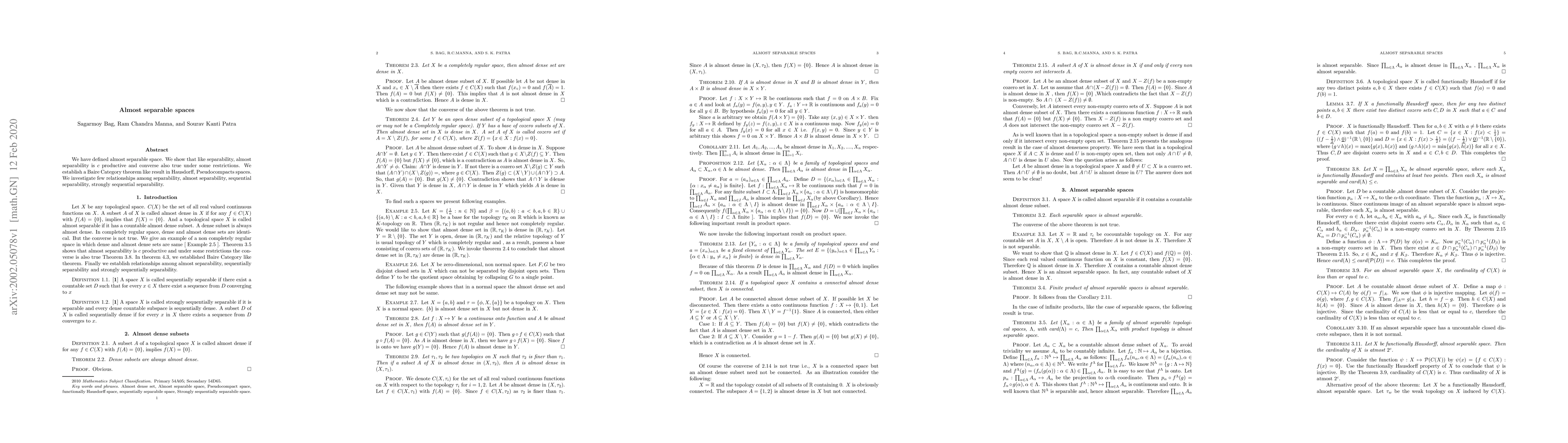 This paper introduces the concept of almost separable spaces, demonstrating that almost separability is $c$ productive and shares similar properties with separability under certain restrictions. It also establishes a Baire Category theorem analogue for Hausdorff, pseudocompact spaces and explores relationships between separability, almost separability, and various types of sequential separability.