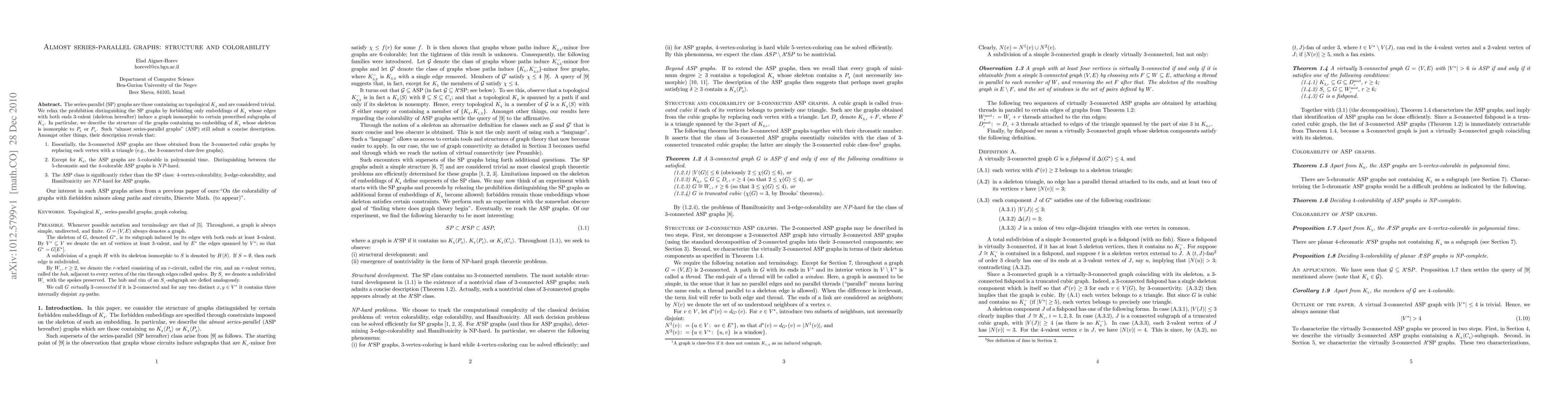 This paper explores "almost series-parallel graphs" (ASP) that relax the structure of series-parallel graphs by forbidding specific embeddings of $K_{_4}$ in their skeletons. The study reveals their rich structure and complexity, showing they are 5-colorable in polynomial time except for $K_{_6}$ and highlighting the $NP$-hardness of 4-colorability, 3-edge-colorability, and Hamiltonicity for ASP graphs.