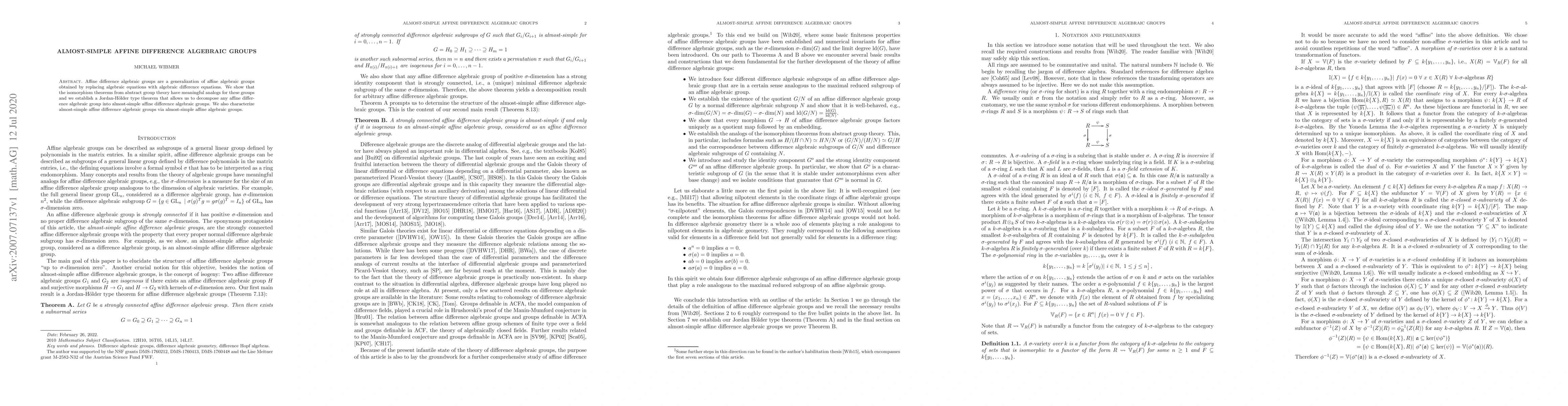 This paper explores affine difference algebraic groups, generalizing affine algebraic groups with difference equations instead of algebraic equations. It establishes isomorphism theorems and a Jordan-Hölder type decomposition for these groups, characterizing almost-simple affine difference algebraic groups through their relation to almost-simple affine algebraic groups.