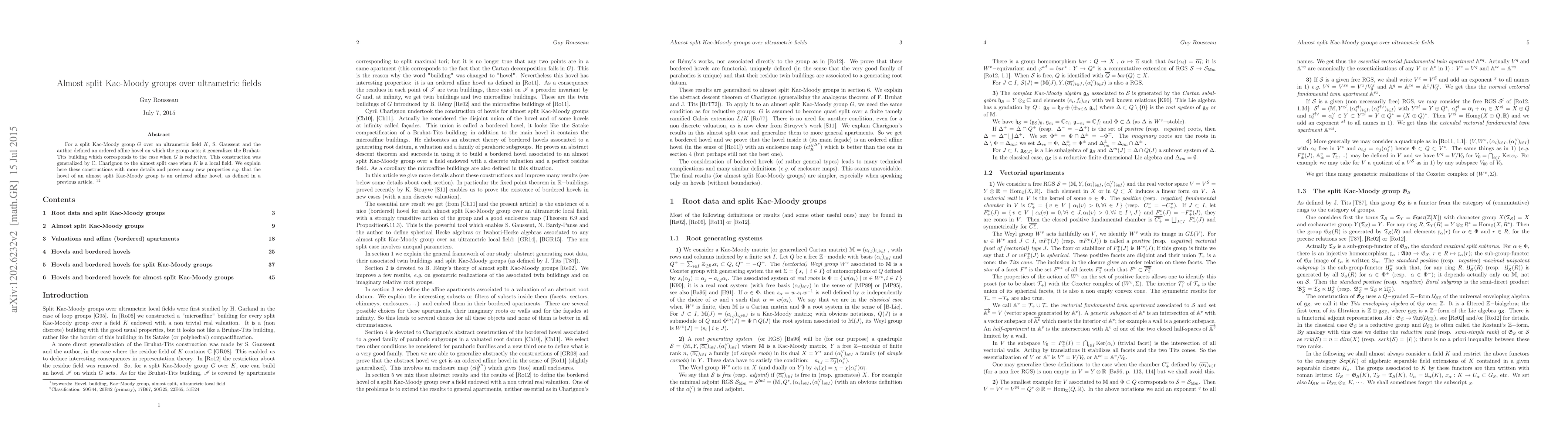 For a split Kac-Moody group G over an ultrametric field K, S. Gaussent and the author defined an ordered affine hovel on which the group acts; it generalizes the Bruhat-Tits building which corresponds to the case when G is reductive. This construction was generalized by C. Charignon to the almost split case when K is a local field. We explain here these constructions with more details and prove many new properties e.g. that the hovel of an almost split Kac-Moody group is an ordered affine hovel, as defined in a previous article.