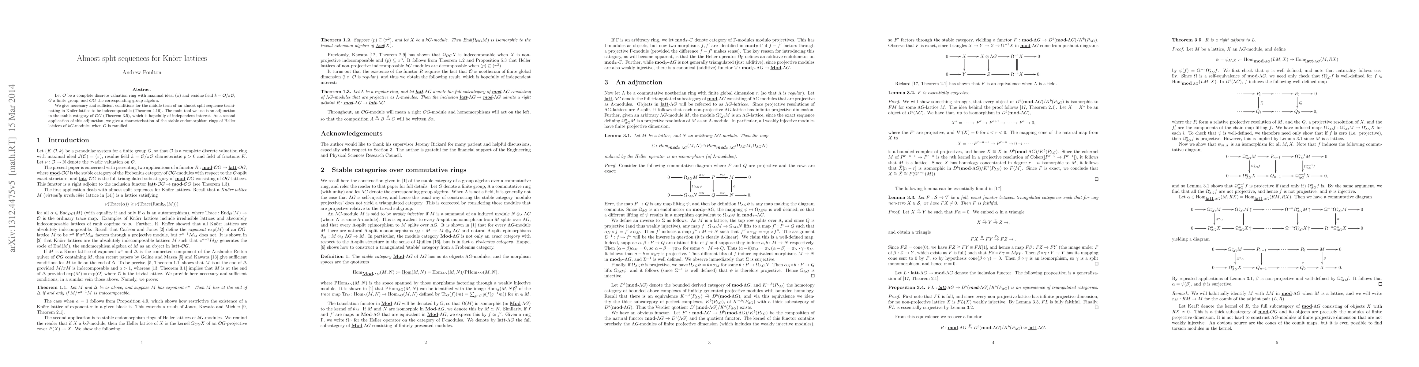 The paper establishes conditions for an almost split sequence in Knorr lattices to terminate indecomposably and characterizes the stable endomorphism rings of Heller lattices in group G modules.