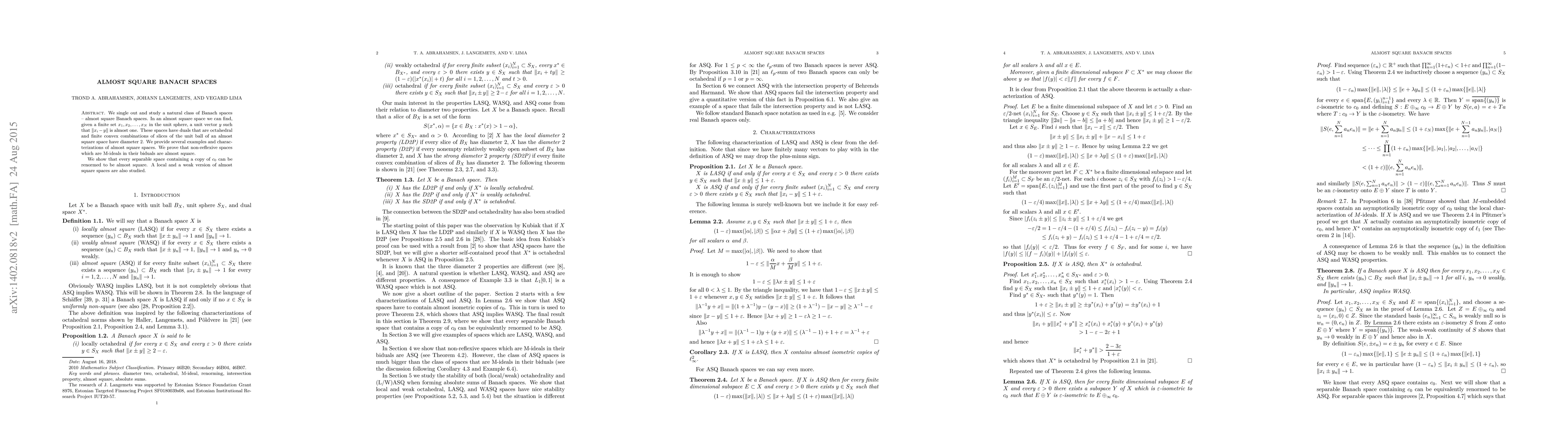 This paper explores the class of almost square Banach spaces, characterized by the existence of a unit vector that approximates given points on the unit sphere. The duals of these spaces are octahedral, and their unit balls exhibit specific geometric properties. The authors provide examples, characterizations, and prove that non-reflexive M-ideals and separable spaces containing $c_0$ can be renormed to be almost square.