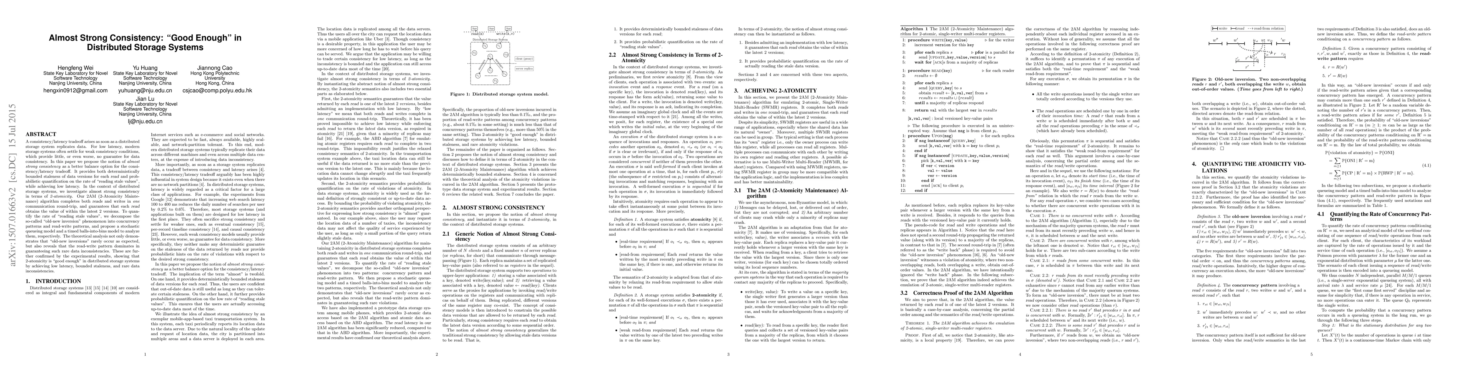 This paper proposes "almost strong consistency" as a balanced alternative to the consistency/latency tradeoff in distributed storage systems, introducing the 2AM algorithm for 2-atomicity. It achieves low latency, bounded staleness, and rare data inconsistencies, supported by theoretical analysis and experimental validation.