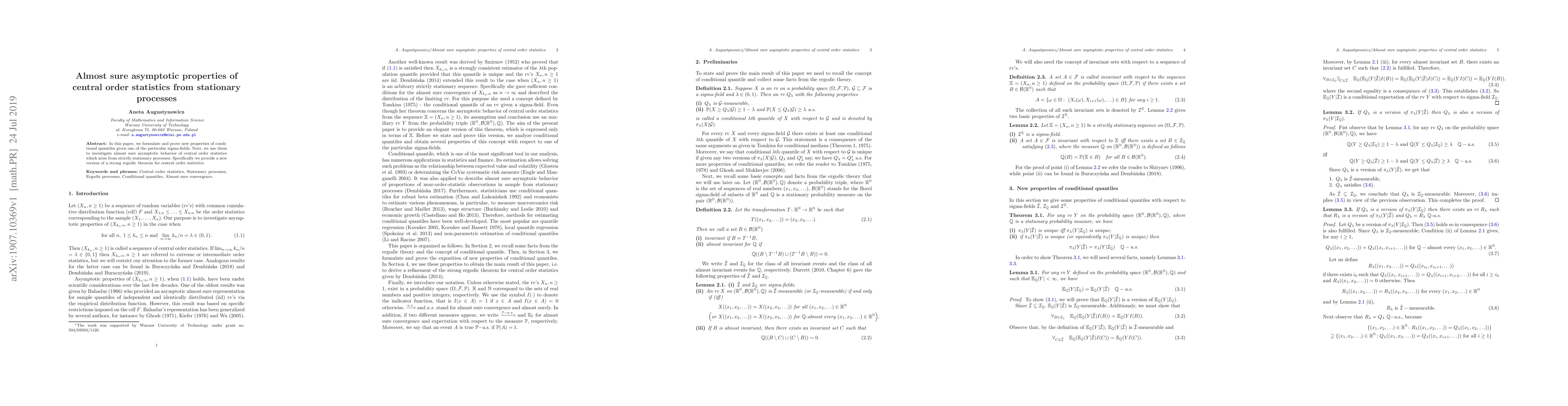 In this paper, we formulate and prove new properties of conditional quantiles given one of the particular sigma-fields. Next, we use them to investigate almost sure asymptotic behavior of central order statistics which arise from strictly stationary processes. Specifically we provide a new version of a strong ergodic theorem for central order statistics.