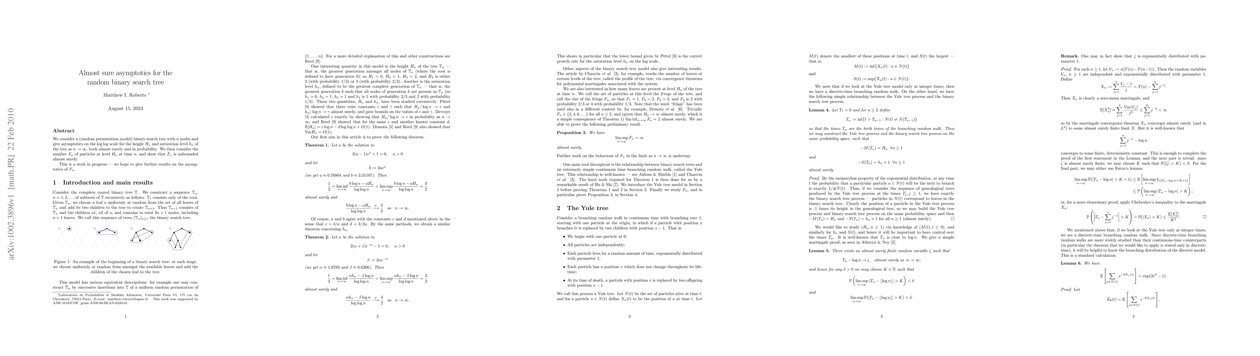 A research paper studies the asymptotic behavior of a random binary search tree, finding almost sure unboundedness of particle counts at specific levels as tree size increases.