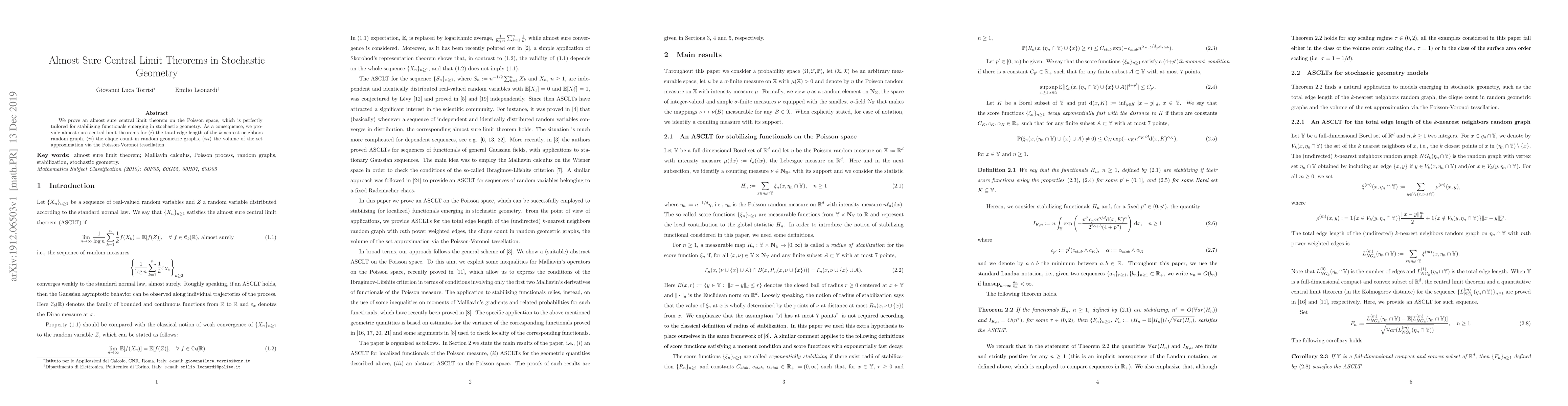 This paper proves an almost sure central limit theorem for Poisson space, specifically addressing stabilizing functionals in stochastic geometry. It extends this theorem to the total edge length of $k$-nearest neighbor graphs, clique counts in random geometric graphs, and the volume approximation via Poisson-Voronoi tessellations.