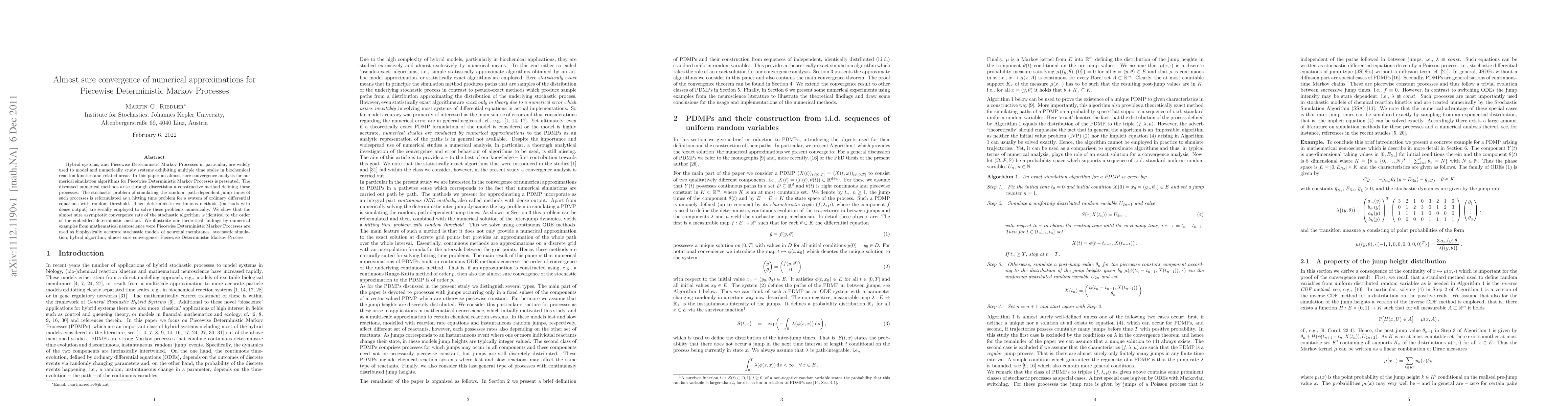 This paper analyzes the almost sure convergence of numerical algorithms for simulating Piecewise Deterministic Markov Processes, reformulating the stochastic problem as a hitting time problem for ordinary differential equations. It demonstrates that the convergence rate matches the order of the embedded deterministic method, illustrated with examples from mathematical neuroscience.