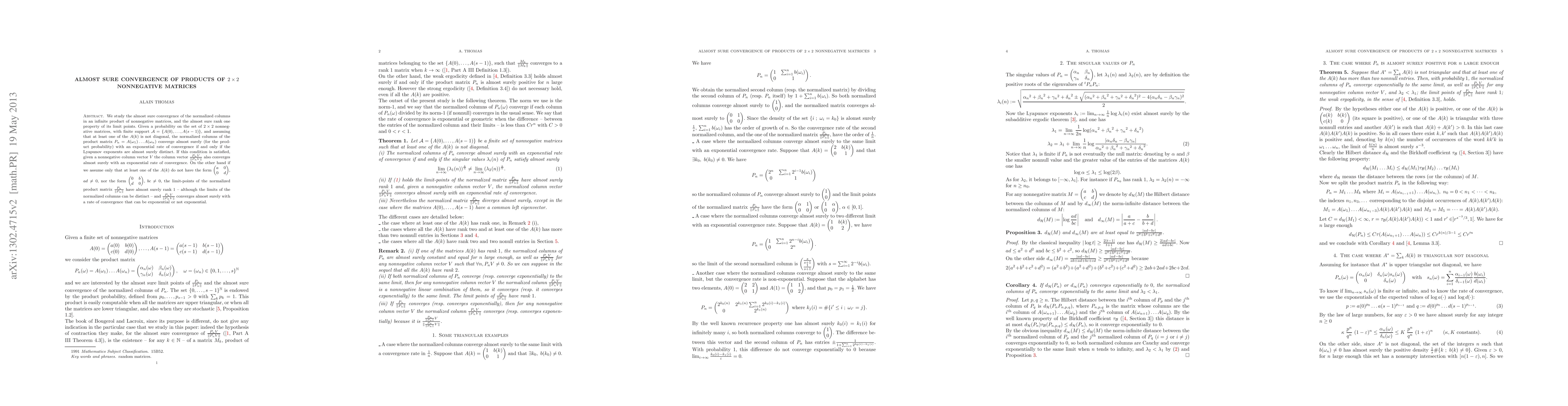 The paper investigates the convergence rate of products of 2x2 nonnegative matrices, finding that almost sure convergence occurs with an exponential rate if Lyapunov exponents are distinct, and limit points have almost surely rank 1 if at least one matrix does not have a specific form.