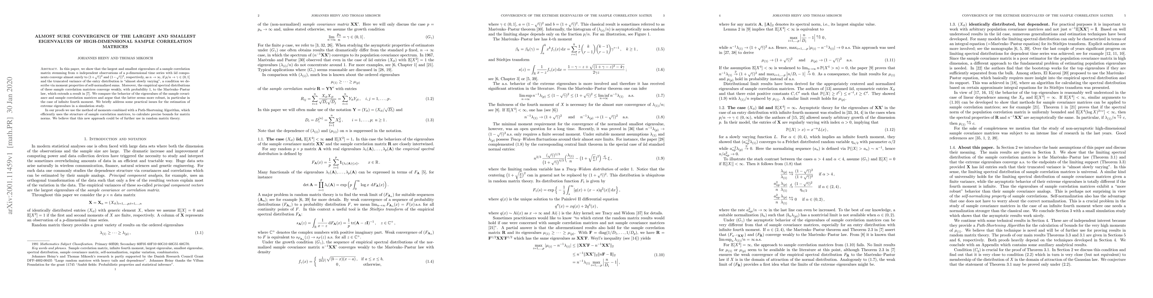 In this paper, we show that the largest and smallest eigenvalues of a sample correlation matrix stemming from $n$ independent observations of a $p$-dimensional time series with iid components converge almost surely to $(1+\sqrt{\gamma})^2$ and $(1-\sqrt{\gamma})^2$, respectively, as $n \to \infty$, if $p/n\to \gamma \in (0,1]$ and the truncated variance of the entry distribution is 'almost slowly varying', a condition we describe via moment properties of self-normalized sums. Moreover, the empirical spectral distributions of these sample correlation matrices converge weakly, with probability 1, to the Marchenko-Pastur law, which extends a result in Bai and Zhou (2008). We compare the behavior of the eigenvalues of the sample covariance and sample correlation matrices and argue that the latter seems more robust, in particular in the case of infinite fourth moment. We briefly address some practical issues for the estimation of extreme eigenvalues in a simulation study. In our proofs we use the method of moments combined with a Path-Shortening Algorithm, which efficiently uses the structure of sample correlation matrices, to calculate precise bounds for matrix norms. We believe that this new approach could be of further use in random matrix theory.