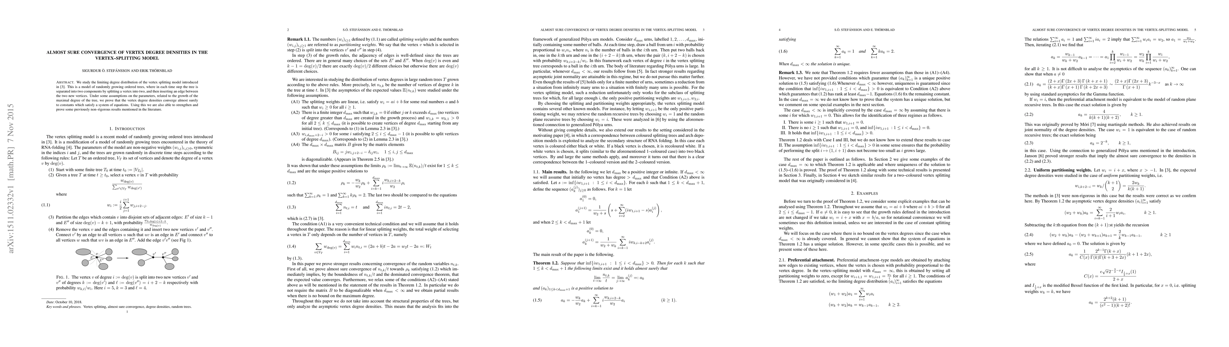 The research examines the vertex splitting model for randomly growing ordered trees, proving almost sure convergence of vertex degree densities to constants under specific parameter conditions, and reinforcing previously mentioned but non-rigorous results.