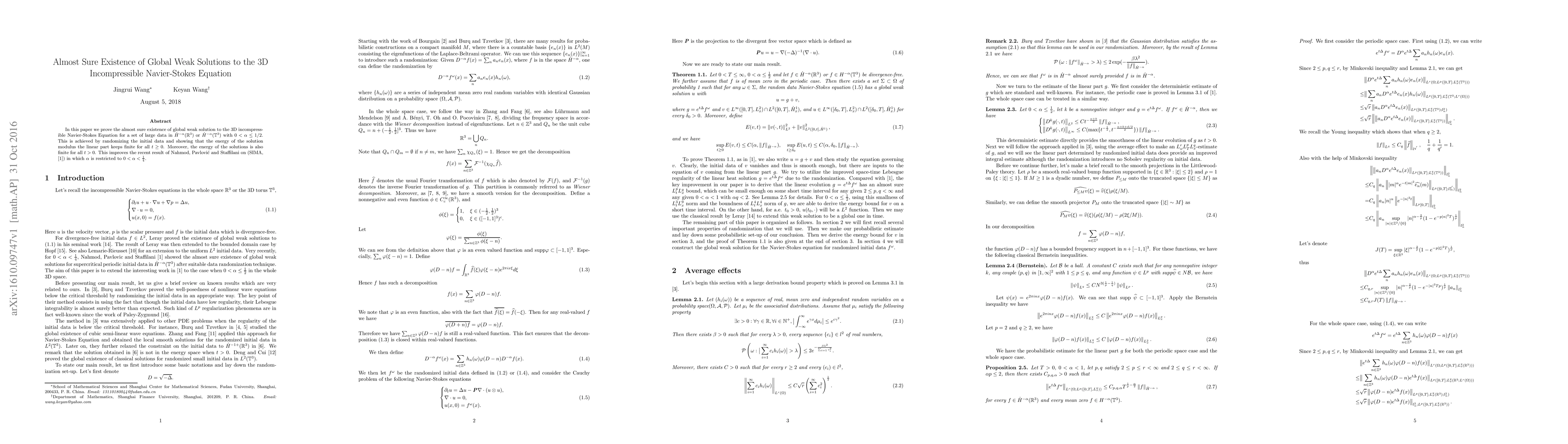This paper proves the almost sure existence of global weak solutions to the 3D incompressible Navier-Stokes Equation for large data, improving upon previous results by extending the range of $\alpha$ from $0<\alpha<\frac{1}{4}$ to $0<\alpha\leq 1/2$. The proof utilizes randomized initial data and finite energy conditions.