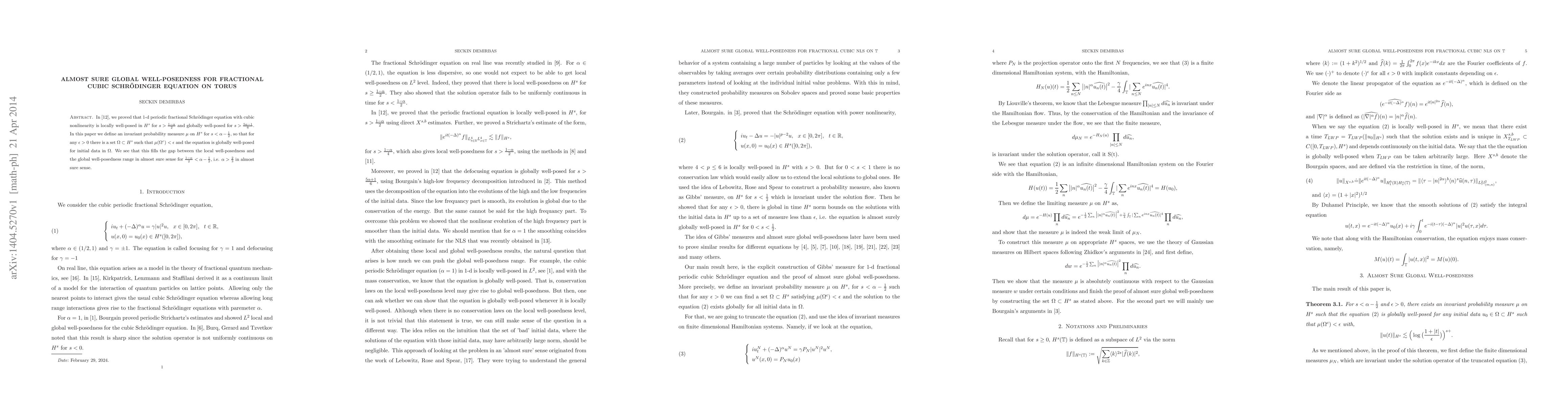 This paper establishes almost sure global well-posedness for the fractional cubic Schrödinger equation on a torus by defining an invariant probability measure, filling the gap between local and global well-posedness for $\alpha > \frac{2}{3}$.