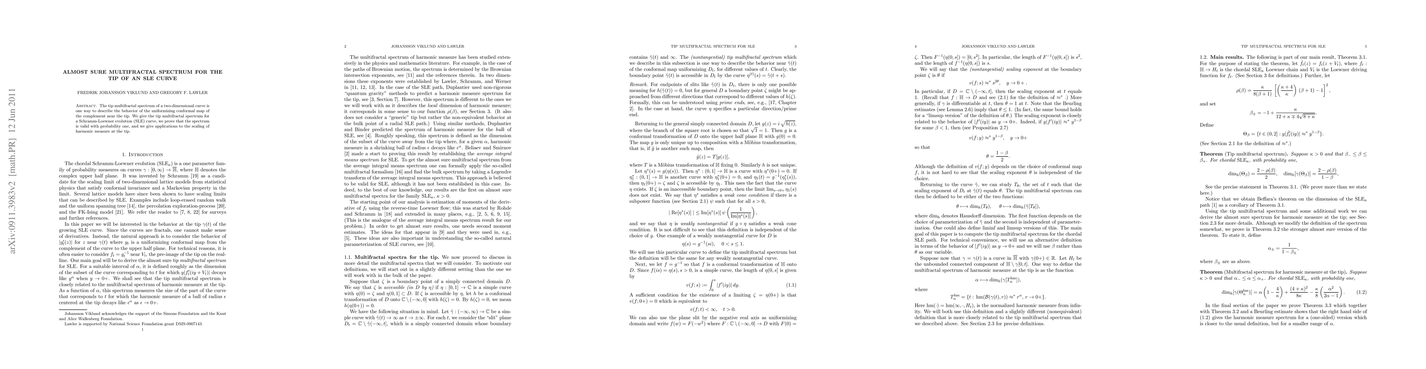 This paper calculates the tip multifractal spectrum of an SLE curve, proving its validity with probability one, and demonstrates applications to harmonic measure scaling at the curve's tip.