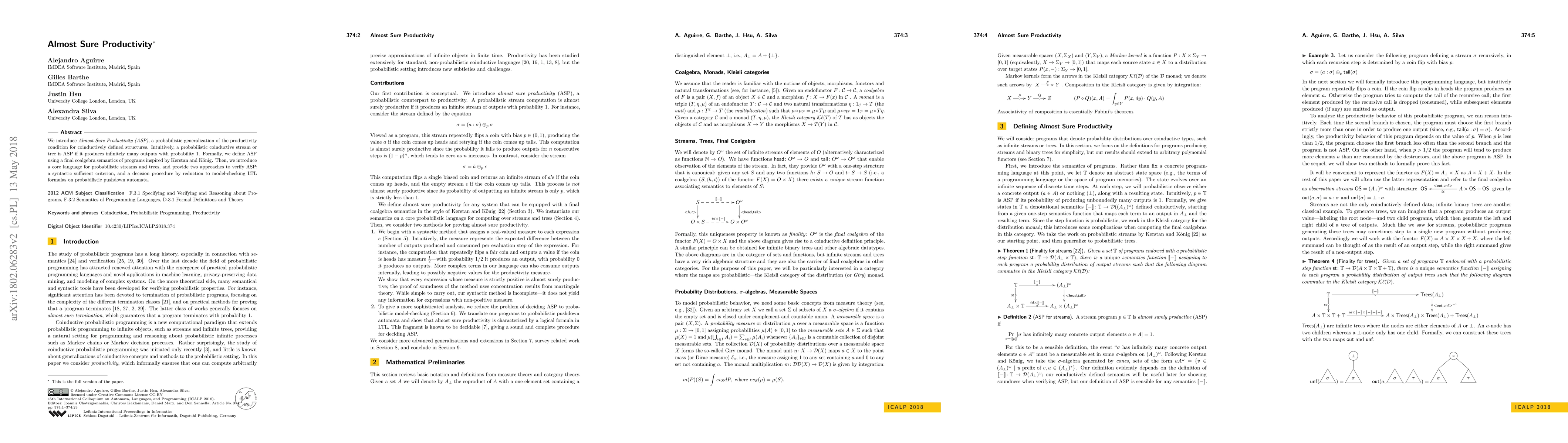 This paper introduces Almost Sure Productivity (ASP), a probabilistic extension of the productivity condition for coinductive structures, ensuring infinite outputs with probability 1. It provides a verification method through a syntactic criterion and model-checking pCTL* formulas, proving ASP decidability in a core probabilistic stream language.