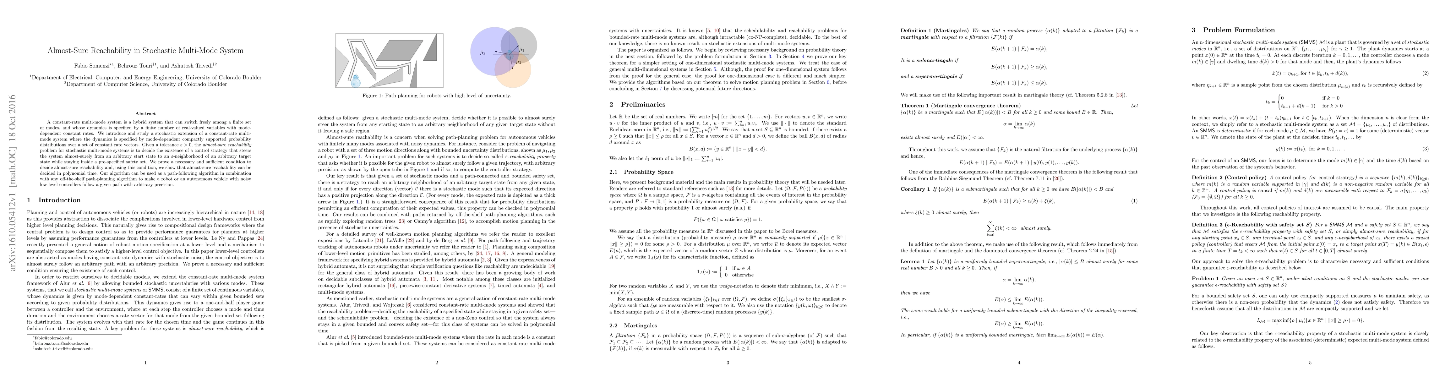 A constant-rate multi-mode system is a hybrid system that can switch freely among a finite set of modes, and whose dynamics is specified by a finite number of real-valued variables with mode-dependent constant rates. We introduce and study a stochastic extension of a constant-rate multi-mode system where the dynamics is specified by mode-dependent compactly supported probability distributions over a set of constant rate vectors. Given a tolerance $\varepsilon > 0$, the almost-sure reachability problem for stochastic multi-mode systems is to decide the existence of a control strategy that steers the system almost-surely from an arbitrary start state to an $\varepsilon$-neighborhood of an arbitrary target state while staying inside a pre-specified safety set. We prove a necessary and sufficient condition to decide almost-sure reachability and, using this condition, we show that almost-sure reachability can be decided in polynomial time. Our algorithm can be used as a path-following algorithm in combination with any off-the-shelf path-planning algorithm to make a robot or an autonomous vehicle with noisy low-level controllers follow a given path with arbitrary precision.