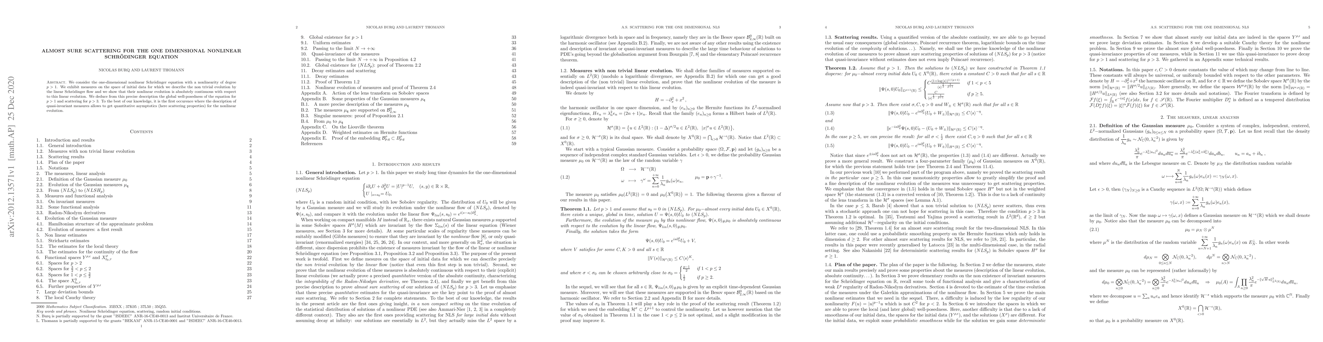 The paper shows that for a one-dimensional nonlinear Schr"odinger equation with nonlinearity degree $p>1$, the global well-posedness and scattering properties can be analyzed using measures on initial data, leading to quantitative asymptotics of the nonlinear evolution.