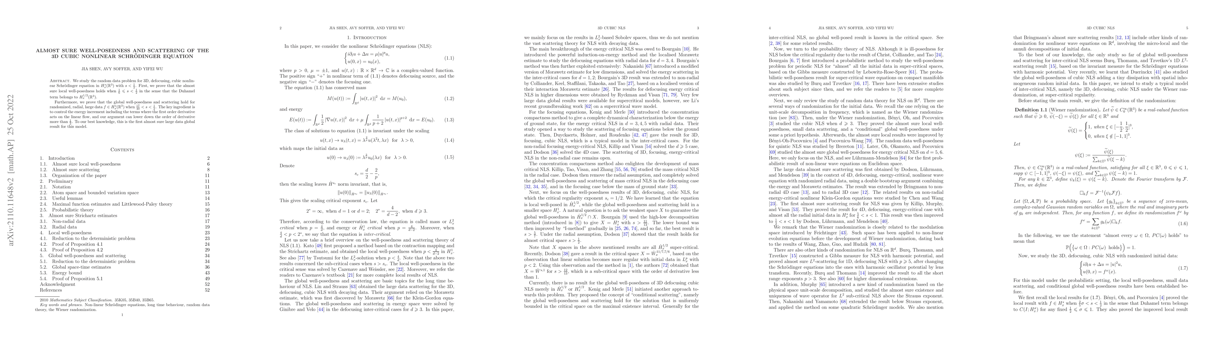This paper investigates the random data problem for the 3D cubic nonlinear Schrödinger equation, proving almost sure local well-posedness for $1/6 \leq s < 1/2$ and global well-posedness with scattering for randomized, radial, large data when $17/40 < s < 1/2$. The key method involves controlling the energy increment, allowing for a lower order of derivative than previously possible.