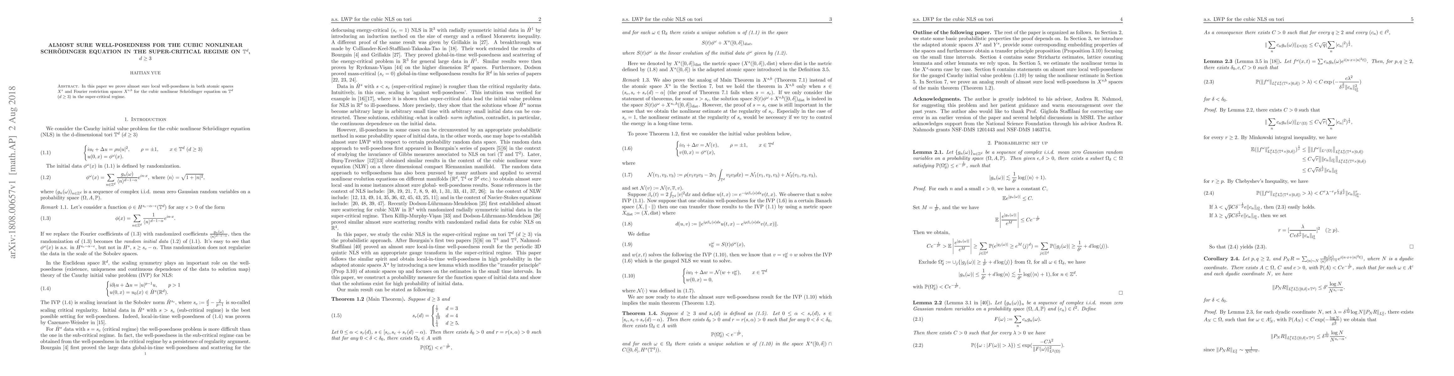 This paper establishes almost sure local well-posedness for the cubic nonlinear Schrödinger equation in the super-critical regime on $\mathbb{T}^d$ ($d\geq 3$), utilizing atomic spaces $X^s$ and Fourier restriction spaces $X^{s, b}$.