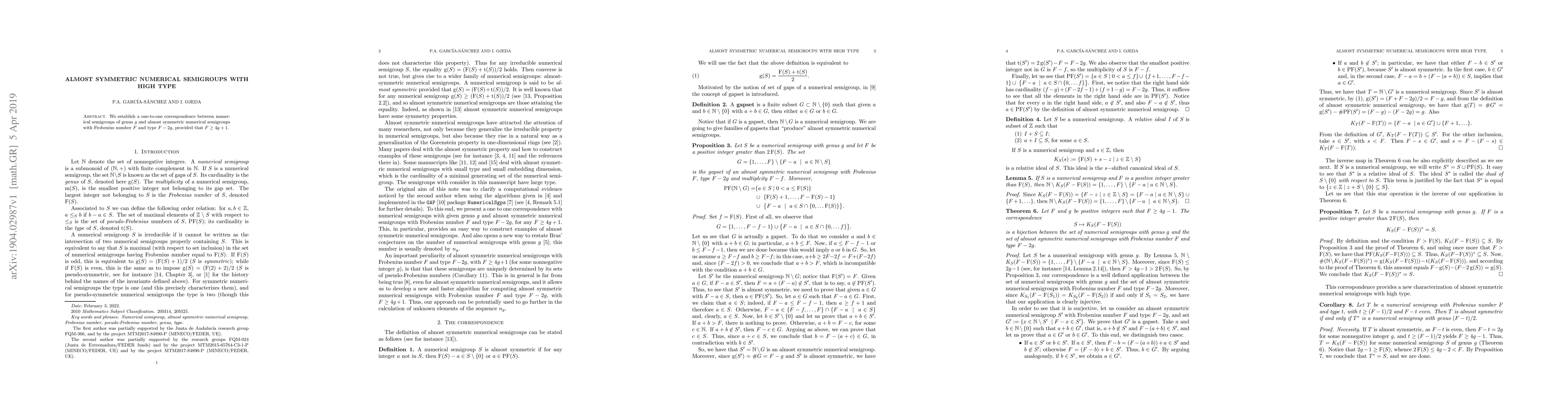 Summary: This paper establishes a one-to-one correspondence between numerical semigroups of genus $g$ and almost symmetric numerical semigroups with a Frobenius number $F$ and type $F-2g$, under the condition that $F > 4g-1$. This correspondence highlights a structural relationship in numerical semigroups.