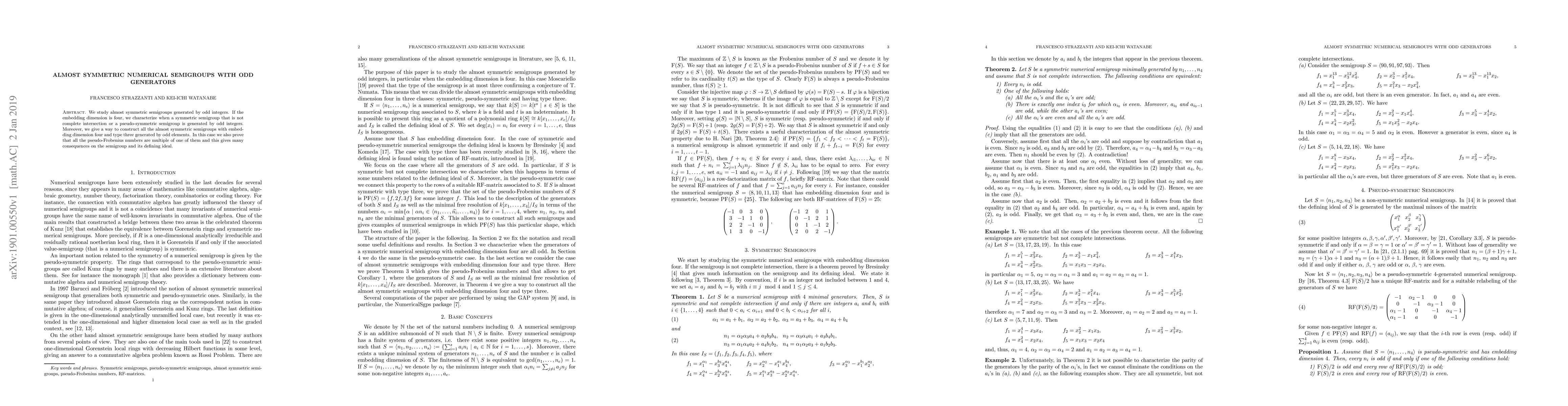 This paper characterizes almost symmetric numerical semigroups with odd generators, particularly focusing on those with an embedding dimension of four. It provides a method to construct these semigroups and proves that their pseudo-Frobenius numbers are multiples of one of the generators, yielding significant insights into the semigroup and its defining ideal.