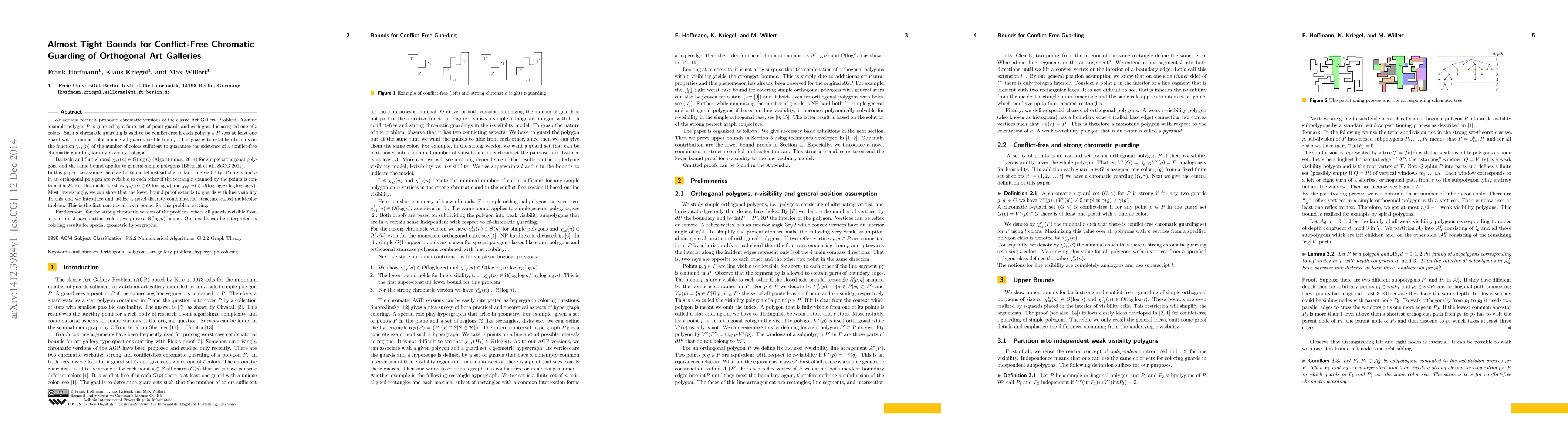 We address recently proposed chromatic versions of the classic Art Gallery Problem. Assume a simple polygon $P$ is guarded by a finite set of point guards and each guard is assigned one of $t$ colors. Such a chromatic guarding is said to be conflict-free if each point $p\in P$ sees at least one guard with a unique color among all guards visible from $p$. The goal is to establish bounds on the function $\chi_{cf}(n)$ of the number of colors sufficient to guarantee the existence of a conflict-free chromatic guarding for any $n$-vertex polygon. B\"artschi and Suri showed $\chi_{cf}(n)\in O(\log n)$ (Algorithmica, 2014) for simple orthogonal polygons and the same bound applies to general simple polygons (B\"artschi et al., SoCG 2014). In this paper, we assume the r-visibility model instead of standard line visibility. Points $p$ and $q$ in an orthogonal polygon are r-visible to each other if the rectangle spanned by the points is contained in $P$. For this model we show $\chi_{cf}(n)\in O(\log\log n)$ and $\chi_{cf}(n)\in \Omega(\log\log n /\log\log\log n)$. Most interestingly, we can show that the lower bound proof extends to guards with line visibility. To this end we introduce and utilize a novel discrete combinatorial structure called multicolor tableau. This is the first non-trivial lower bound for this problem setting.Furthermore, for the strong chromatic version of the problem, where all guards r-visible from a point must have distinct colors, we prove a $\Theta(\log n)$-bound. Our results can be interpreted as coloring results for special geometric hypergraphs.