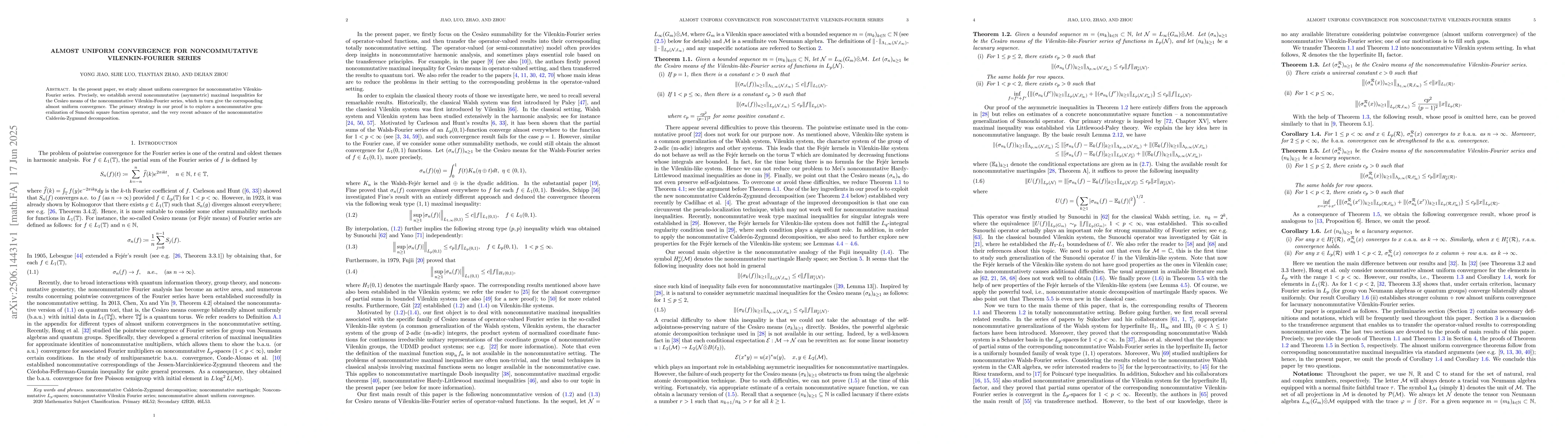 In the present paper, we study almost uniform convergence for noncommutative Vilenkin-Fourier series. Precisely, we establish several noncommutative (asymmetric) maximal inequalities for the Ces\`{a}ro means of the noncommutative Vilenkin-Fourier series, which in turn give the corresponding almost uniform convergence. The primary strategy in our proof is to explore a noncommutative generalization of Sunouchi square function operator, and the very recent advance of the noncommutative Calder\'{o}n-Zygmund decomposition.