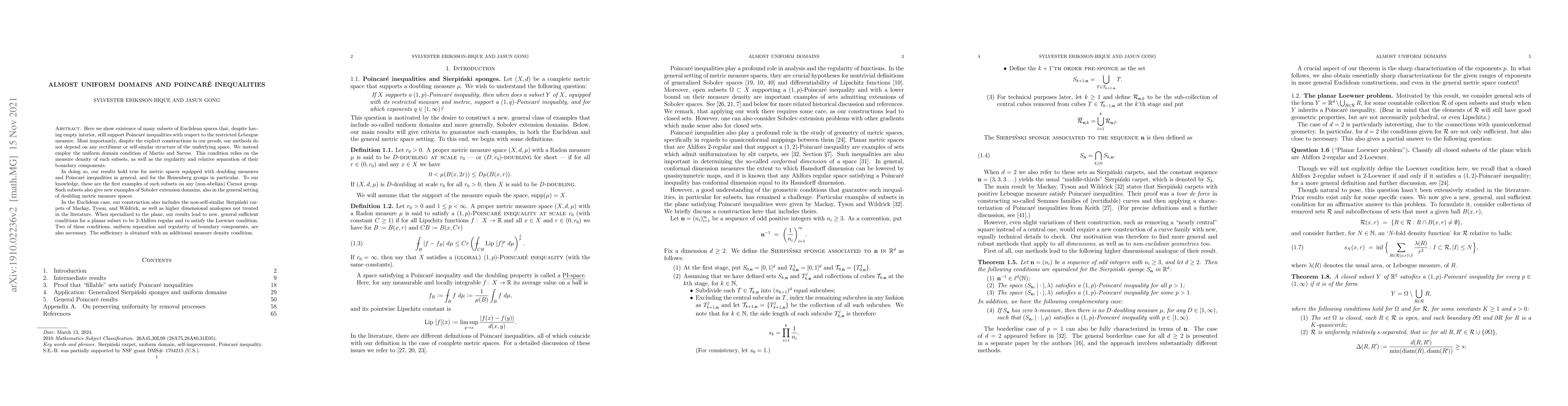 This paper establishes the existence of subsets in Euclidean and metric spaces that support Poincaré inequalities despite having empty interiors, using the notion of uniform domains. The methods are applicable to metric spaces with doubling measures and Poincaré inequalities, particularly on Heisenberg groups, and introduce new Sobolev extension domains. Specialized to the plane, it provides sufficient conditions for subsets to be Ahlfors 2-regular and satisfy a (1,2)-Poincaré inequality, and analyzes the Sierpiński carpets without using Semmes families.