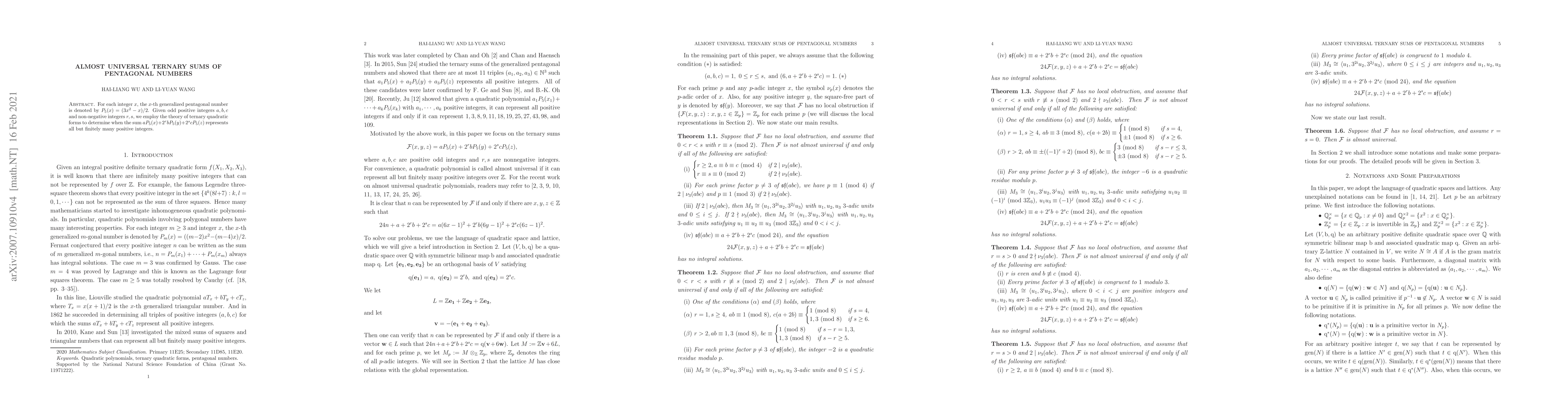 For each integer $x$, the $x$-th generalized pentagonal number is denoted by $P_5(x)=(3x^2-x)/2$. Given odd positive integers $a,b,c$ and non-negative integers $r,s$, we employ the theory of ternary quadratic forms to determine when the sum $aP_5(x)+2^rbP_5(y)+2^scP_5(z)$ represents all but finitely many positive integers.