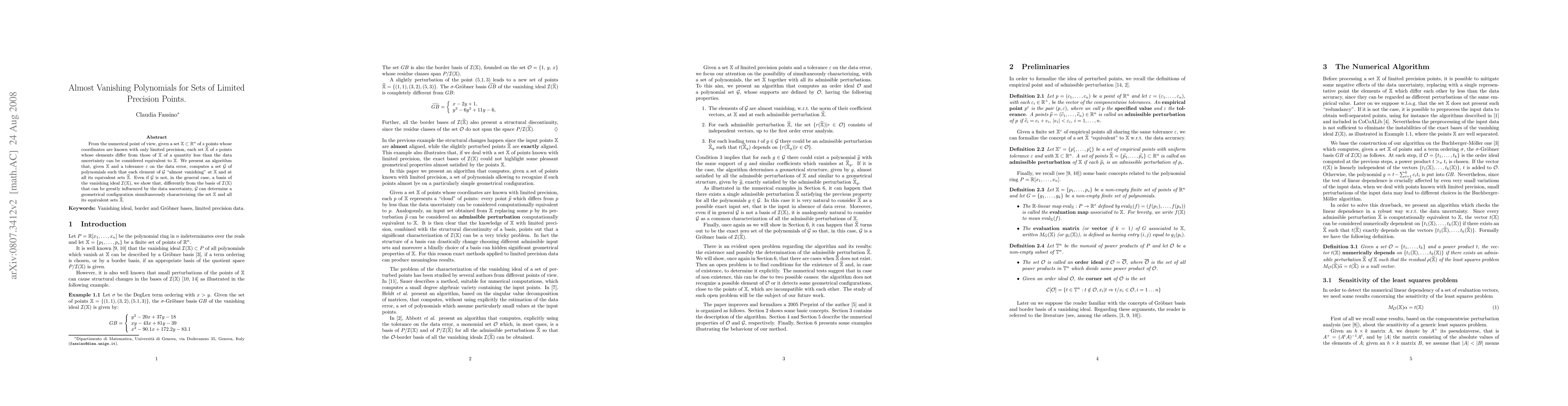 Let X be a set of s points whose coordinates are known with only limited From the numerical point of view, given a set X of s real points whose coordinates are known with only limited precision, each set X* of real points whose elements differ from those of X of a quantity less than the data uncertainty can be considered equivalent to X. We present an algorithm that, given X and a tolerance Tol on the data error, computes a set G of polynomials such that each element of G "almost vanishing" at X and at all its equivalent sets X*. Even if G is not, in the general case, a basis of the vanishing ideal I(X), we show that, differently from the basis of I(X) that can be greatly influenced by the data uncertainty, G can determine a geometrical configuration simultaneously characterizing the set X and all its equivalent sets X*.