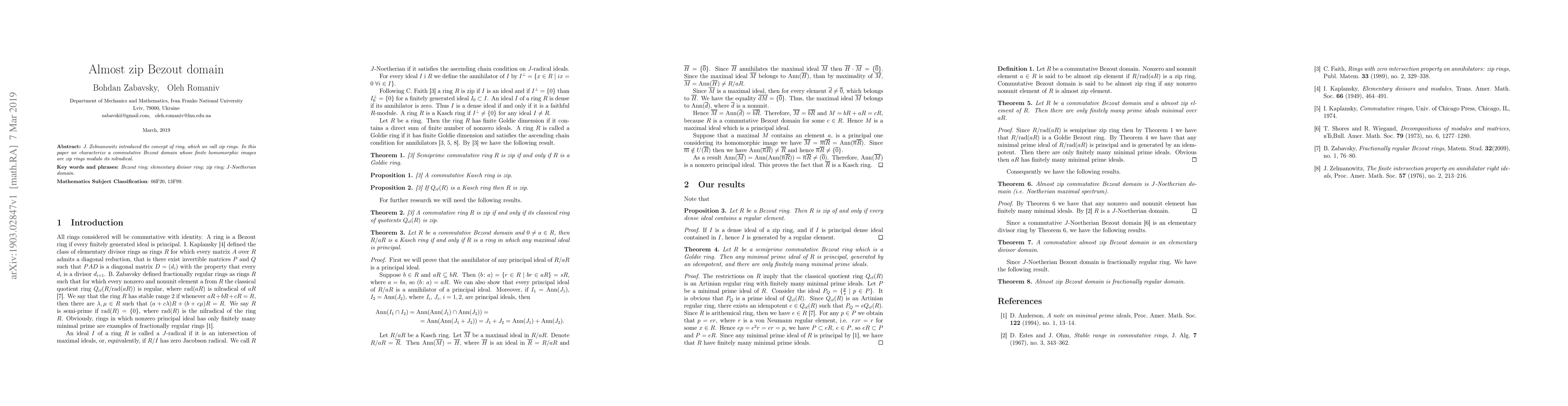 Summary: This paper explores zip rings, a concept introduced by J. Zelmanowitz, and characterizes a specific type of commutative Bezout domain where its finite homomorphic images are zip rings modulo the nilradical.