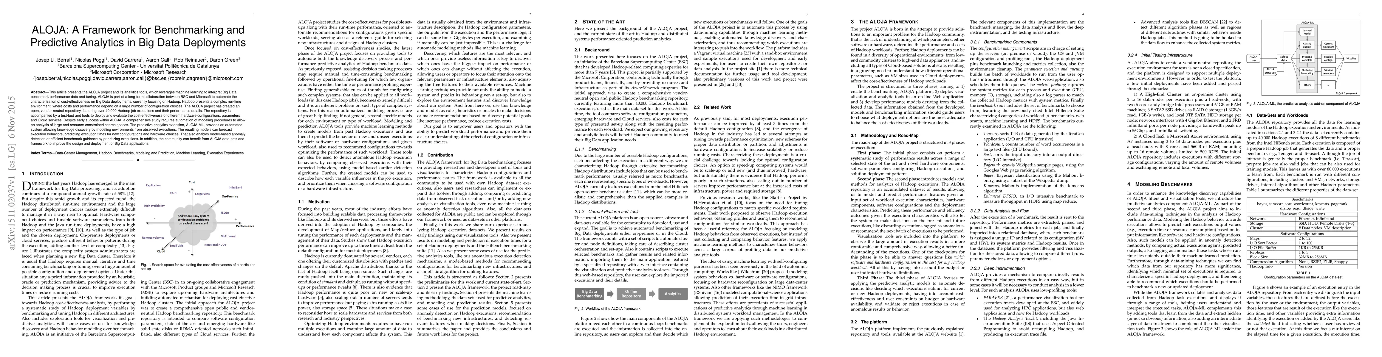 This article presents the ALOJA project and its analytics tools, which leverages machine learning to interpret Big Data benchmark performance data and tuning. ALOJA is part of a long-term collaboration between BSC and Microsoft to automate the characterization of cost-effectiveness on Big Data deployments, currently focusing on Hadoop. Hadoop presents a complex run-time environment, where costs and performance depend on a large number of configuration choices. The ALOJA project has created an open, vendor-neutral repository, featuring over 40,000 Hadoop job executions and their performance details. The repository is accompanied by a test-bed and tools to deploy and evaluate the cost-effectiveness of different hardware configurations, parameters and Cloud services. Despite early success within ALOJA, a comprehensive study requires automation of modeling procedures to allow an analysis of large and resource-constrained search spaces. The predictive analytics extension, ALOJA-ML, provides an automated system allowing knowledge discovery by modeling environments from observed executions. The resulting models can forecast execution behaviors, predicting execution times for new configurations and hardware choices. That also enables model-based anomaly detection or efficient benchmark guidance by prioritizing executions. In addition, the community can benefit from ALOJA data-sets and framework to improve the design and deployment of Big Data applications.