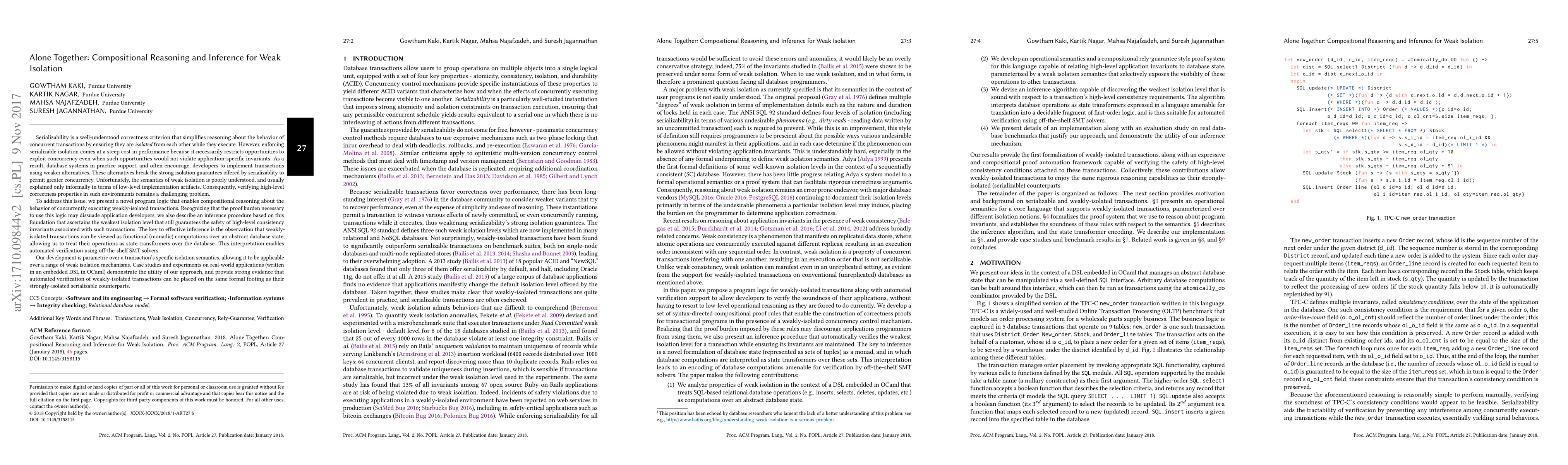 This paper introduces a novel program logic for compositional reasoning about weakly-isolated concurrent transactions, addressing the lack of understanding of weak isolation semantics. It also presents an inference procedure to determine the minimal isolation level ensuring high-level consistency, leveraging functional computation views and automated verification with SMT solvers.