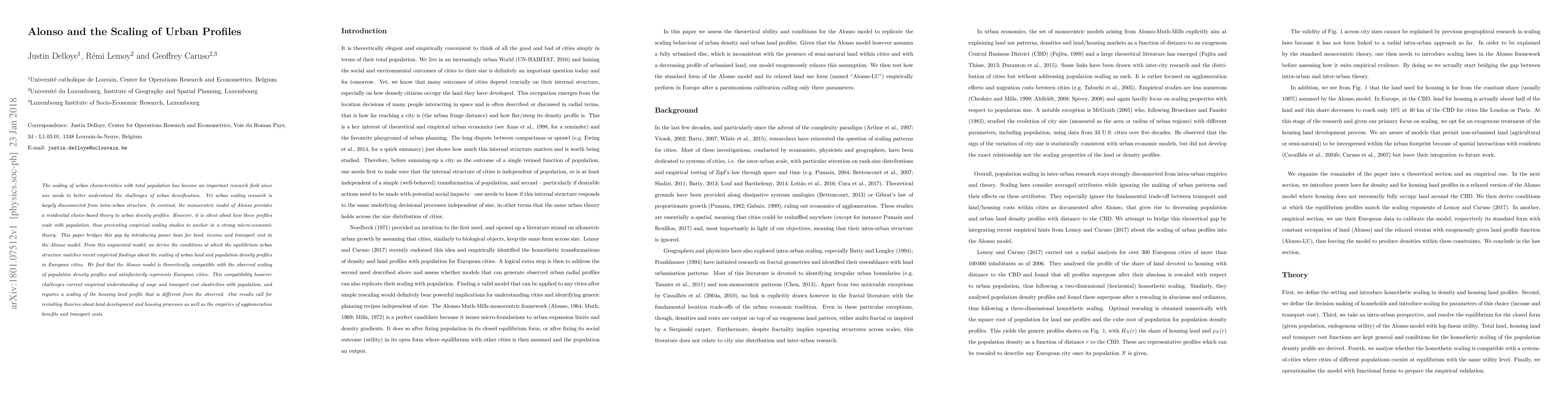 The scaling of urban characteristics with total population has become an important research field since one needs to better understand the challenges of urban densification. Yet urban scaling research is largely disconnected from intra-urban structure. In contrast, the monocentric model of Alonso provides a residential choice-based theory to urban density profiles. However, it is silent about how these profiles scale with population, thus preventing empirical scaling studies to anchor in a strong micro-economic theory. This paper bridges this gap by introducing power laws for land, income and transport cost in the Alonso model. From this augmented model, we derive the conditions at which the equilibrium urban structure matches recent empirical findings about the scaling of urban land and population density profiles in European cities. We find that the Alonso model is theoretically compatible with the observed scaling of population density profiles and satisfactorily represents European cities. This compatibility however challenges current empirical understanding of wage and transport cost elasticities with population, and requires a scaling of the housing land profile that is different from the observed. Our results call for revisiting theories about land development and housing processes as well as the empirics of agglomeration benefits and transport costs.