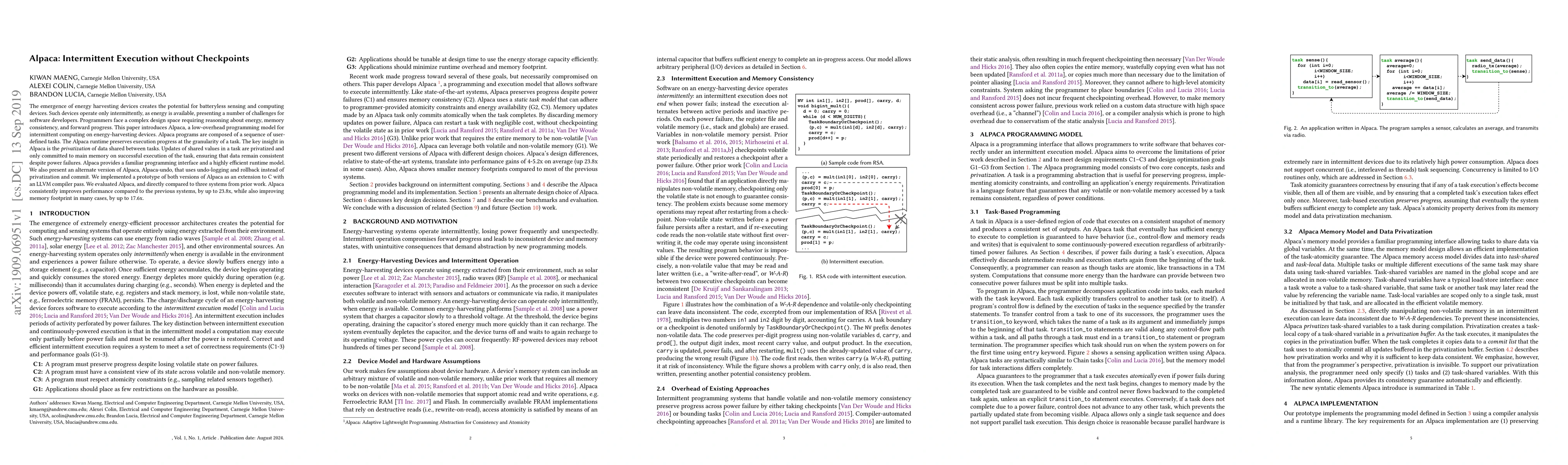 This paper introduces Alpaca, a low-overhead programming model for intermittent computing on energy-harvesting devices, which uses task-based execution and data privatization to ensure consistency and forward progress without checkpoints. Alpaca outperforms prior systems by up to 23.8x in performance and up to 17.6x in memory footprint.