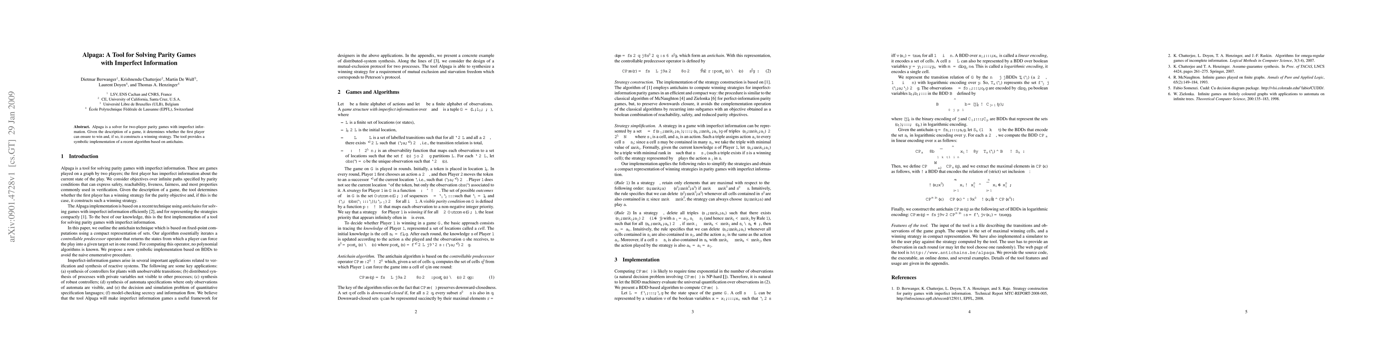 Alpaga is a solver for two-player parity games with imperfect information, determining if the first player can guarantee a win and constructing a winning strategy using a symbolic antichains-based algorithm.