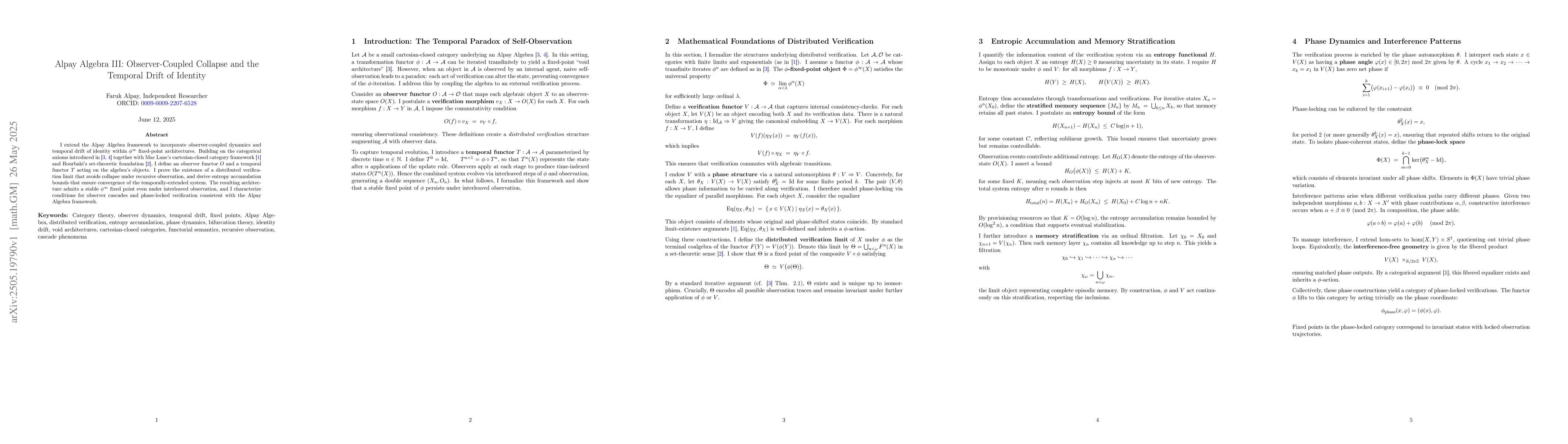 The paper builds upon Alpay Algebra I and II, introducing observer-coupled {\phi}-collapse through transfinite categorical flows and curvature-driven identity operators, formalizing temporal identity drift via recursive deformation of identity signatures under observer influence.