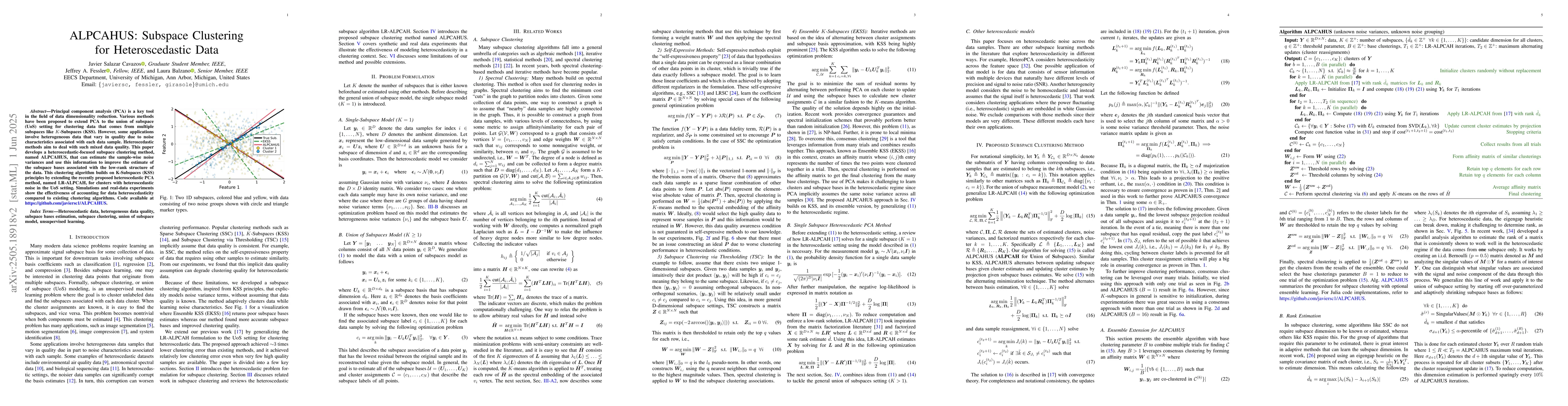 ALPCAHUS differentiates itself by focusing on heteroscedasticity in the context of subspace clustering, extending the LR-ALPCAH method, and providing empirical validation through simulations and real-data experiments.