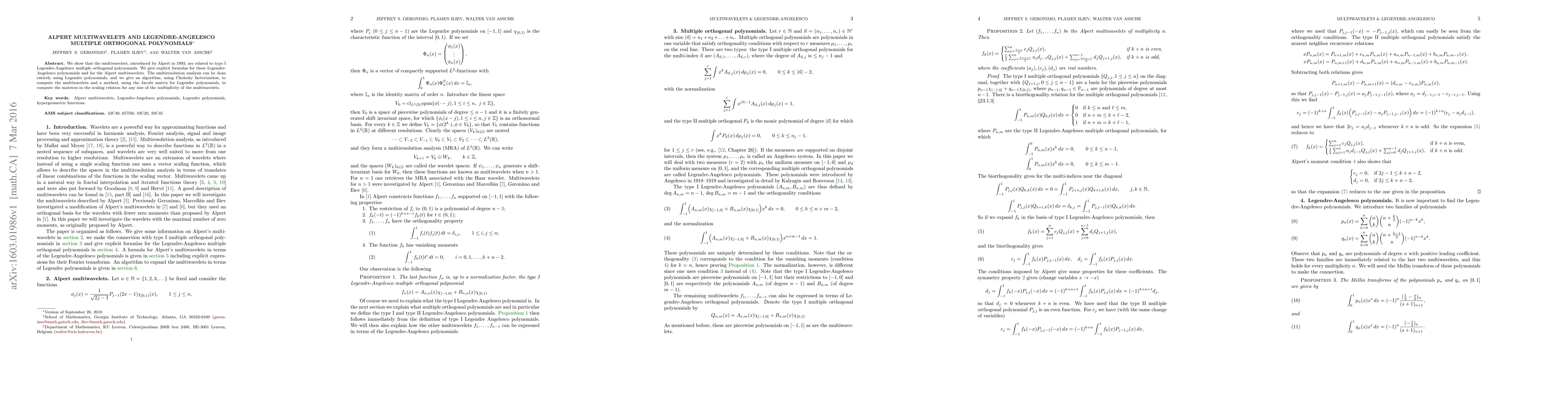 Summary: Alpert multiwavelets are connected to type I Legendre-Angelesco multiple orthogonal polynomials, with explicit formulas provided. A multiresolution analysis utilizing Legendre polynomials is possible, and algorithms employing Cholesky factorization and Jacobi matrices are presented for computing multiwavelets and scaling matrices.