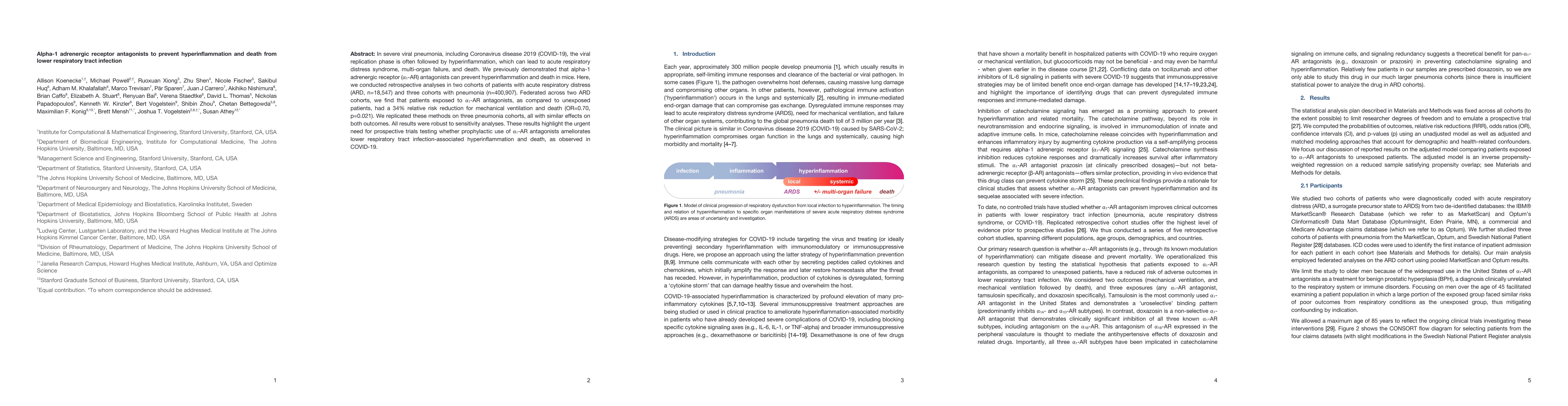 In severe viral pneumonia, including Coronavirus disease 2019 (COVID-19), the viral replication phase is often followed by hyperinflammation, which can lead to acute respiratory distress syndrome, multi-organ failure, and death. We previously demonstrated that alpha-1 adrenergic receptor ($\alpha_1$-AR) antagonists can prevent hyperinflammation and death in mice. Here, we conducted retrospective analyses in two cohorts of patients with acute respiratory distress (ARD, n=18,547) and three cohorts with pneumonia (n=400,907). Federated across two ARD cohorts, we find that patients exposed to $\alpha_1$-AR antagonists, as compared to unexposed patients, had a 34% relative risk reduction for mechanical ventilation and death (OR=0.70, p=0.021). We replicated these methods on three pneumonia cohorts, all with similar effects on both outcomes. All results were robust to sensitivity analyses. These results highlight the urgent need for prospective trials testing whether prophylactic use of $\alpha_1$-AR antagonists ameliorates lower respiratory tract infection-associated hyperinflammation and death, as observed in COVID-19.