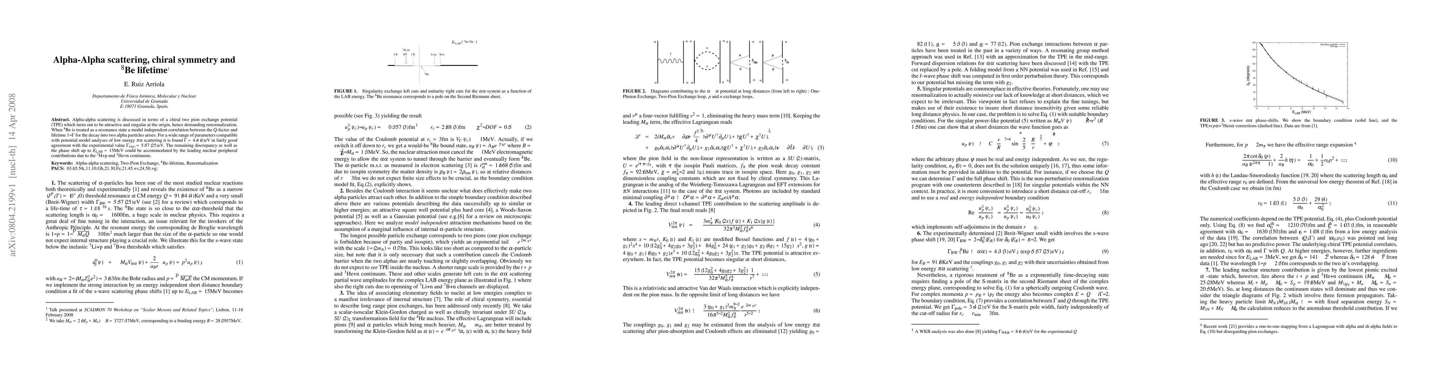 Alpha-alpha scattering is discussed in terms of a chiral two pion exchange potential which turns out to be attractive and singular at the origin, hence demanding renormalization. When 8Be is treated as a resonance state a model independent correlation between the Q-factor and lifetime 1/Gamma for the decay into two alpha particles arises. For a wide range of parameters compatible with potential model analyses of low energy pi-alpha scattering it is found Gamma = 4.4(4)eV} in fairly good agreement with the experimental value Gamma = 5.57 (25) eV. The remaining discrepancy as well as the phase shift up to ELAB=15MeV could be accommodated by the leading nuclear peripheral contributions due to the 3H+p and 3He+n continuum.
