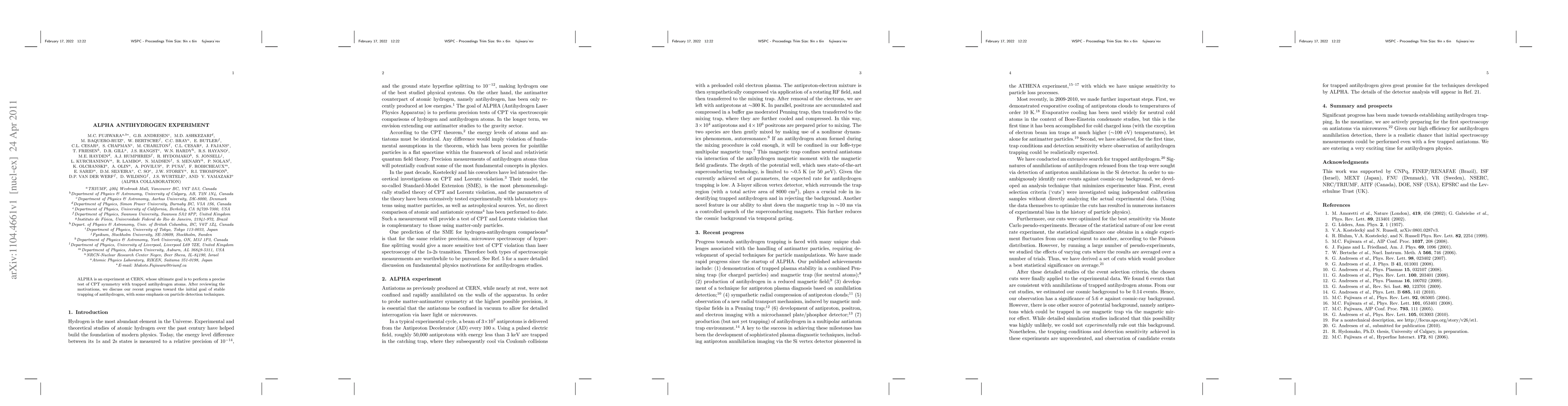 The ALPHA experiment at CERN aims to test CPT symmetry using trapped antihydrogen atoms. Recent progress has focused on achieving stable trapping of antihydrogen, emphasizing advanced particle detection techniques.