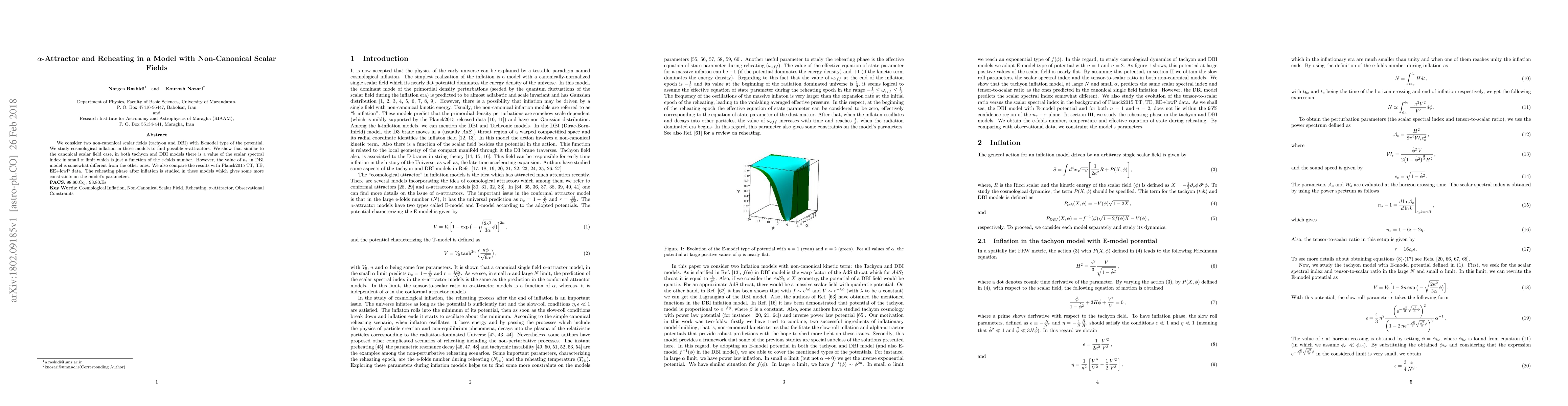 We consider two non-canonical scalar fields (tachyon and DBI) with E-model type of the potential. We study cosmological inflation in these models to find possible $\alpha$-attractors. We show that similar to the canonical scalar field case, in both tachyon and DBI models there is a value of the scalar spectral index in small $\alpha$ limit which is just a function of the e-folds number. However, the value of $n_{s}$ in DBI model is somewhat different from the other ones. We also compare the results with Planck2015 TT, TE, EE+lowP data. The reheating phase after inflation is studied in these models which gives some more constraints on the model's parameters.