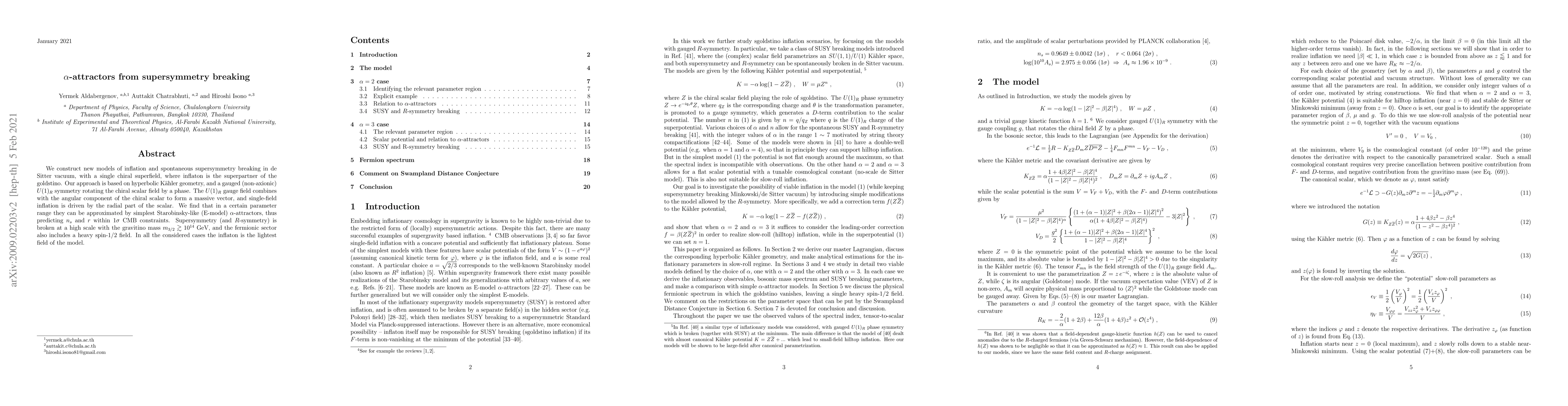 We construct new models of inflation and spontaneous supersymmetry breaking in de Sitter vacuum, with a single chiral superfield, where inflaton is the superpartner of the goldstino. Our approach is based on hyperbolic K\"ahler geometry, and a gauged (non-axionic) $U(1)_R$ symmetry rotating the chiral scalar field by a phase. The $U(1)_R$ gauge field combines with the angular component of the chiral scalar to form a massive vector, and single-field inflation is driven by the radial part of the scalar. We find that in a certain parameter range they can be approximated by simplest Starobinsky-like (E-model) $\alpha$-attractors, thus predicting $n_s$ and $r$ within $1\sigma$ CMB constraints. Supersymmetry (and $R$-symmetry) is broken at a high scale with the gravitino mass $m_{3/2}\gtrsim 10^{14}$ GeV, and the fermionic sector also includes a heavy spin-$1/2$ field. In all the considered cases the inflaton is the lightest field of the model.