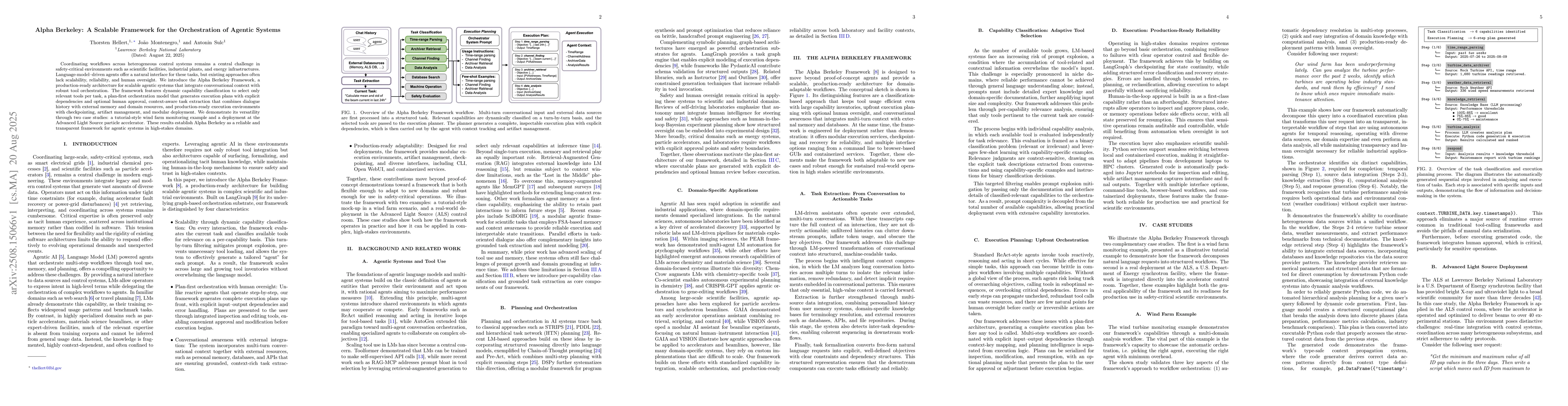 Coordinating workflows across heterogeneous control systems remains a central challenge in safety-critical environments such as scientific facilities, industrial plants, and energy infrastructures. Language-model-driven agents offer a natural interface for these tasks, but existing approaches often lack scalability, reliability, and human oversight. We introduce the Alpha Berkeley Framework, a production-ready architecture for scalable agentic systems that integrate conversational context with robust tool orchestration. The framework features dynamic capability classification to select only relevant tools per task, a plan-first orchestration model that generates execution plans with explicit dependencies and optional human approval, context-aware task extraction that combines dialogue history with external memory and domain resources, and production-ready execution environments with checkpointing, artifact management, and modular deployment. We demonstrate its versatility through two case studies: a tutorial-style wind farm monitoring example and a deployment at the Advanced Light Source particle accelerator. These results establish Alpha Berkeley as a reliable and transparent framework for agentic systems in high-stakes domains.